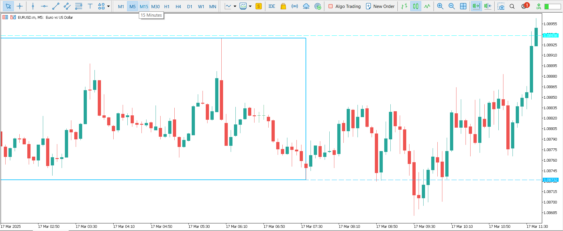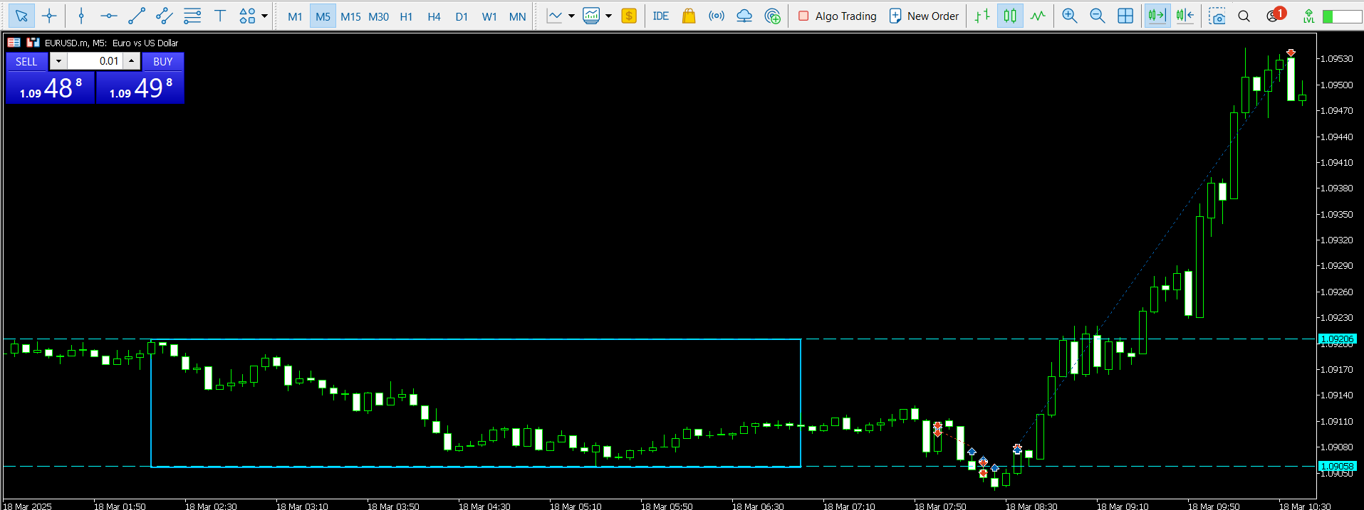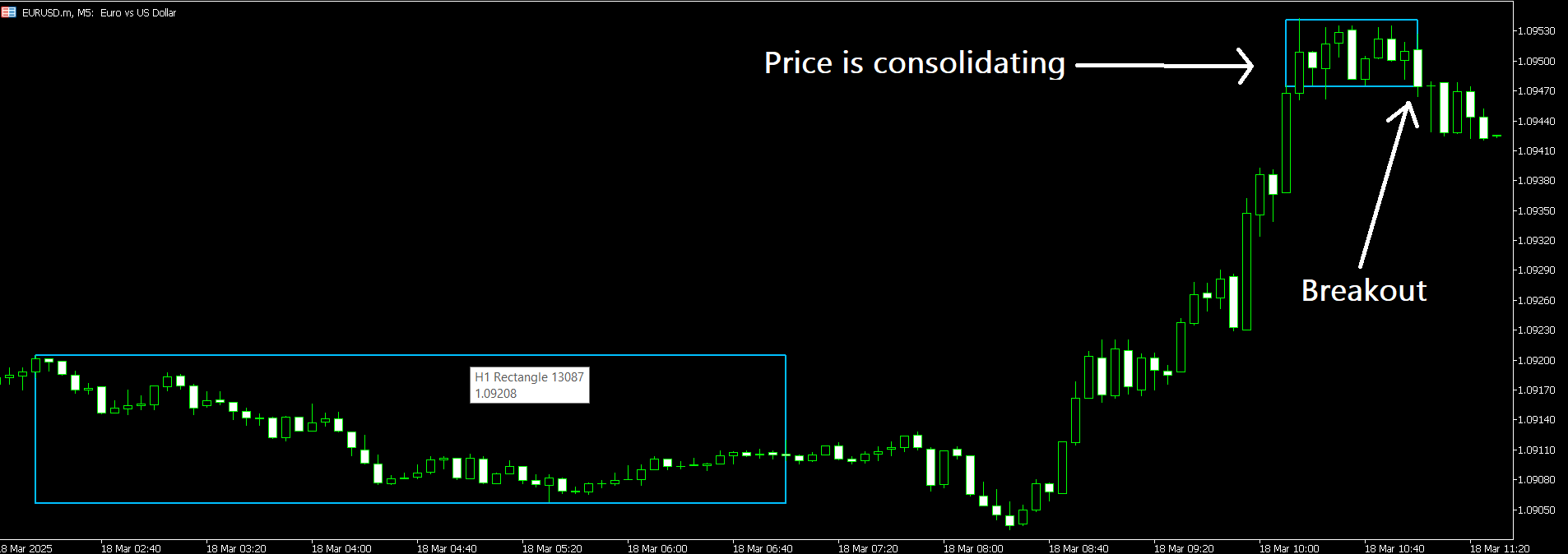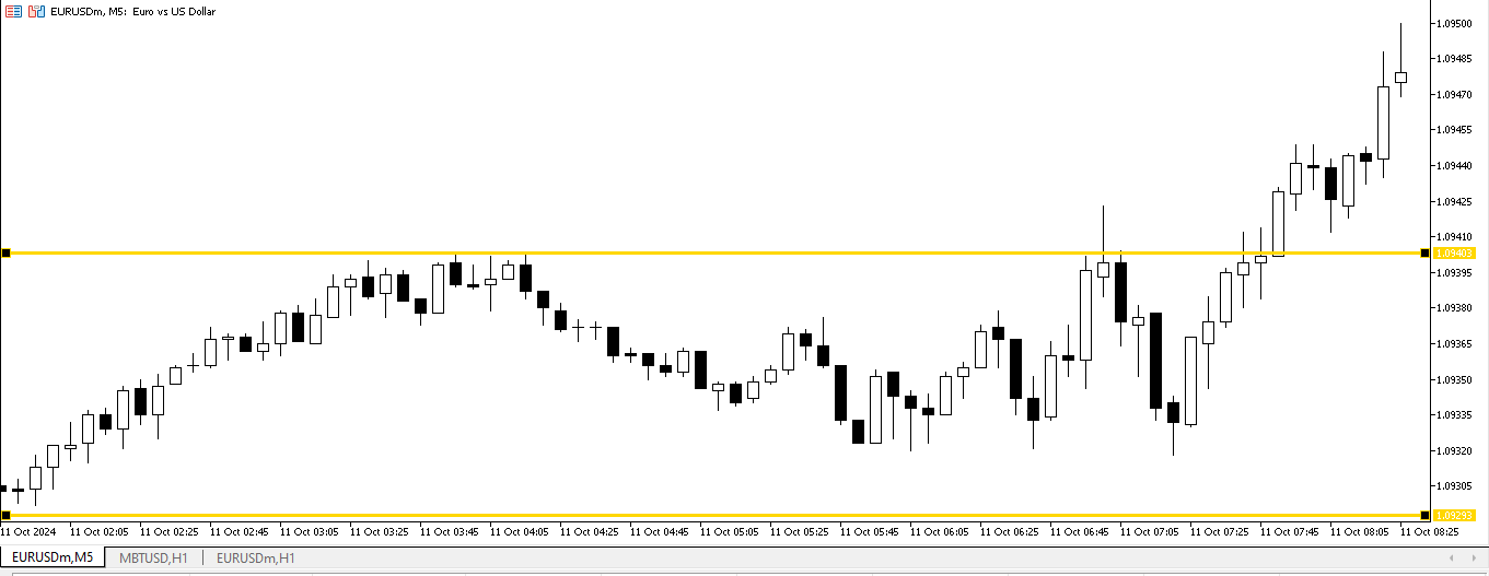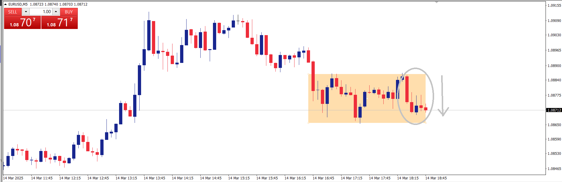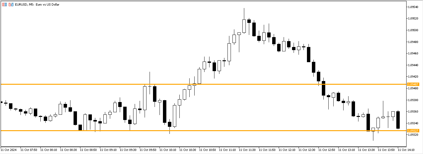 This afternoon I noticed EUR/USD was consolidating in a sideways movement so I drew a box around it to mark the high and low of the range.