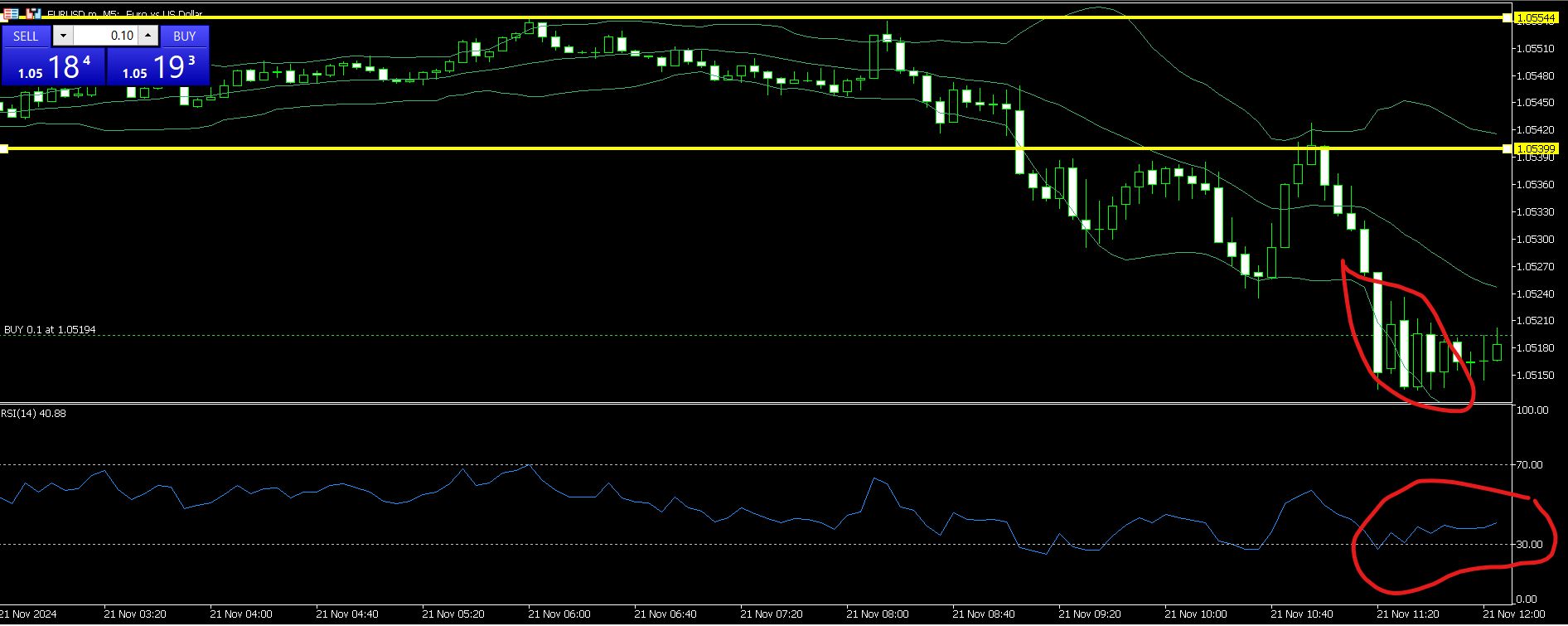 EUR/USD is looking oversold. Look at the RSI oscillator indicator below- it is near the 30 mark meaning oversold.