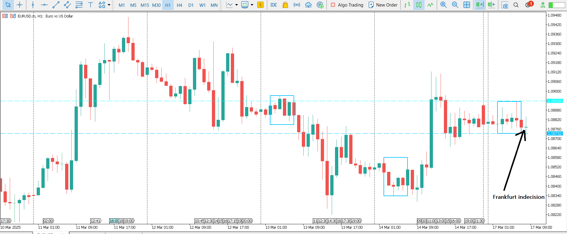 Today I woke up early in the morning to prepare for the London session and looking at the 1H EURUSD chart, I noticed the Frankfurt session candle was a doji meaning indecision.