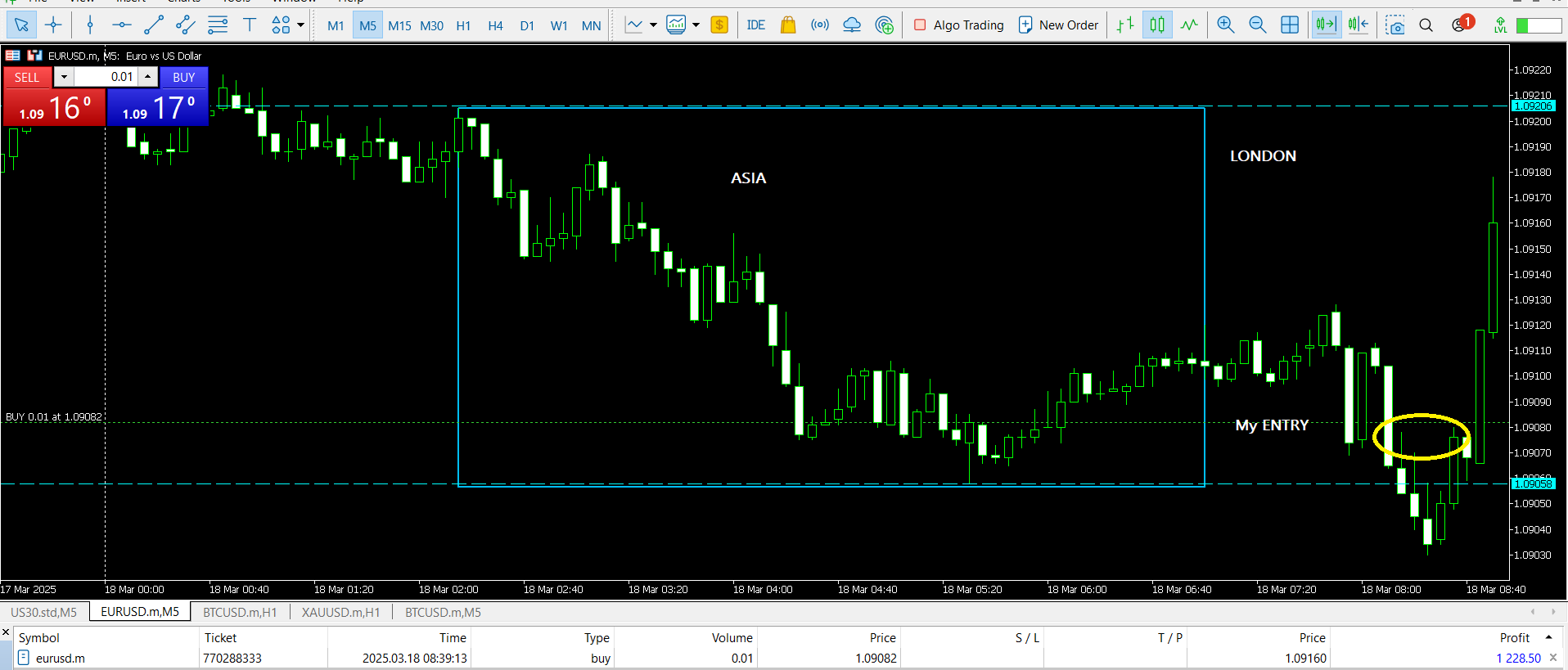 Price broke out from the Asian low so Ii waited for it to retest the breakout candle before I entered a long trade. I eventually made a profit of around 5 pips before exiting when price started going down.
