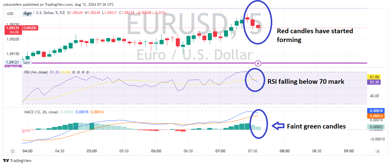 Red candles have started forming coupled with the fact that the RSI indicator has started falling below 70 and the MACD indicator has started showing faint green candles meaning weak upward pressure.