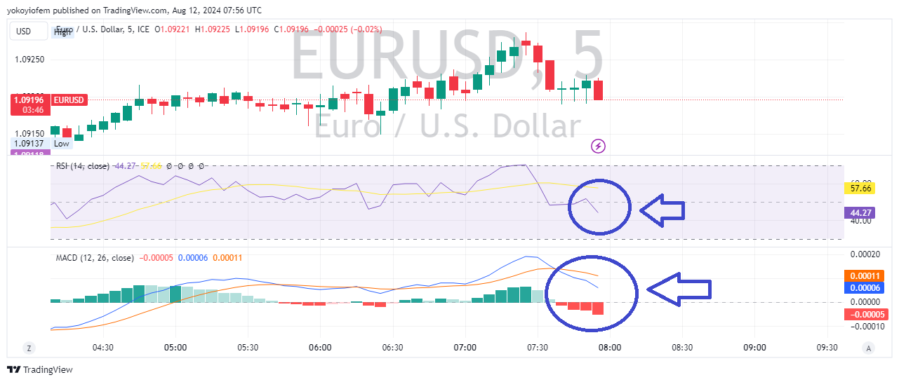 The RSI indicator reading has fallen from around 70 to around 50 and the MACD indicator histogram is now showing red candles meaning downward pressure.