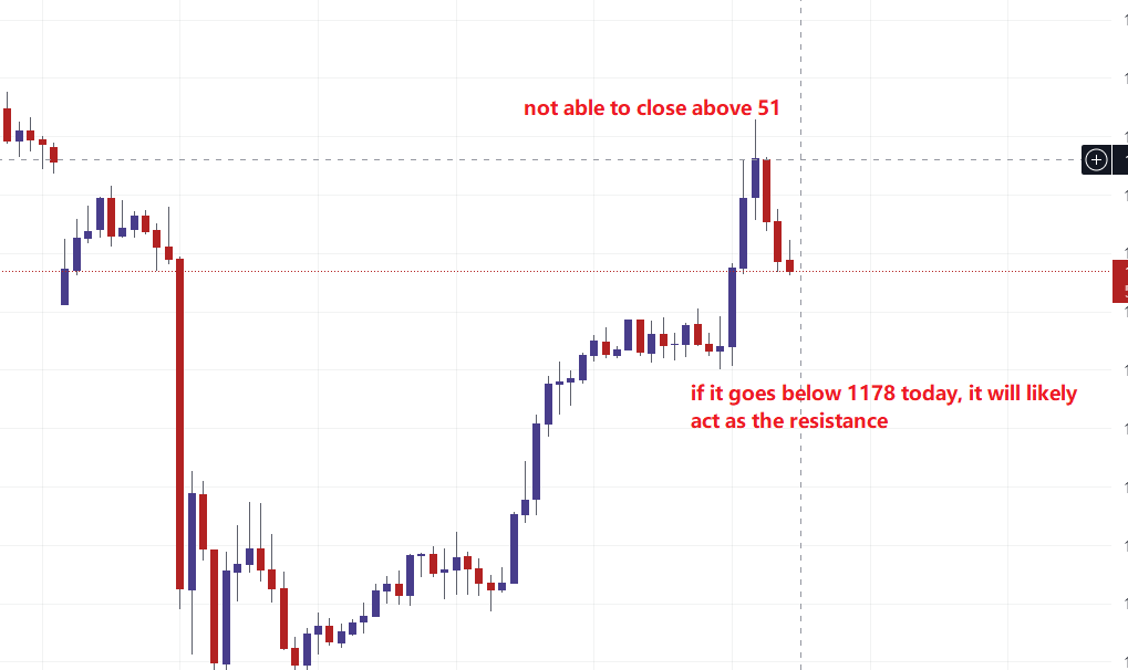 It did get very close to 1270 (1267 is the actual level, almost touch & go). Maybe it will test it again today or tomorrow, I don't know. But if it closes above 1178, it will act as resistance.