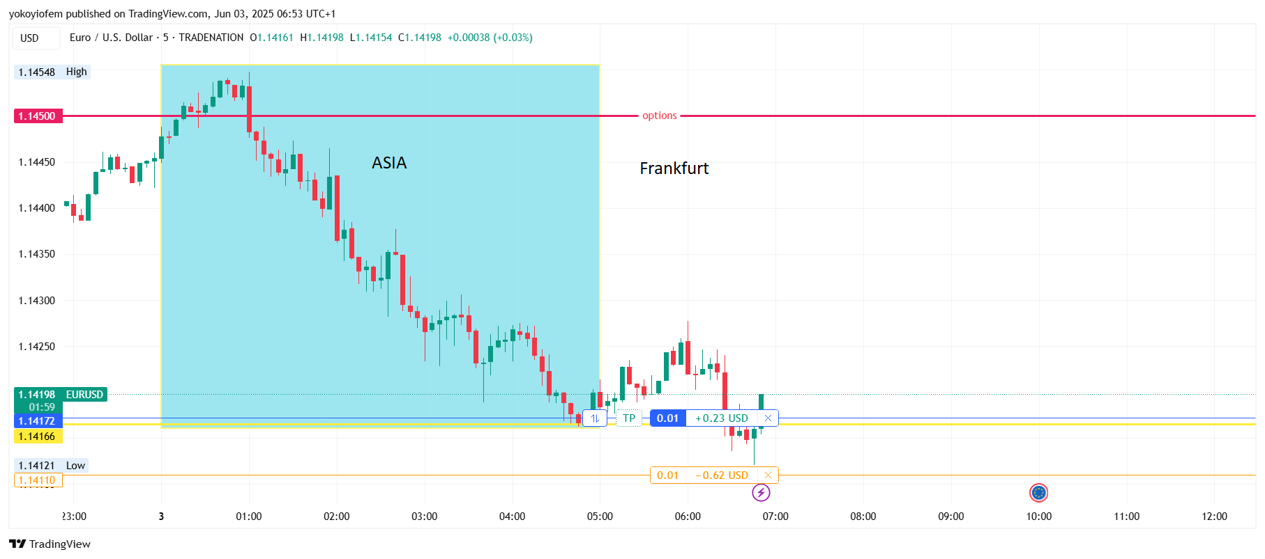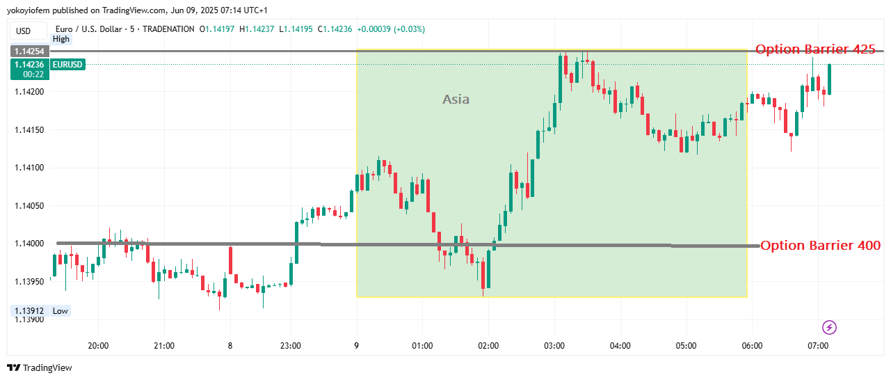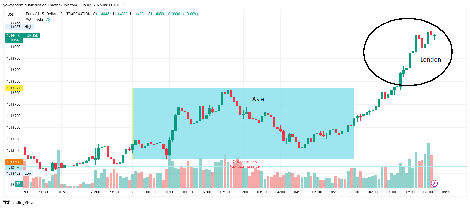 Price is still ranging inbetween the option orders stacked at 1400 and 1450. The Frankfurt session ends and London session starts in 12 minutes, I expect it to bring some momentum to push price out of the current range.