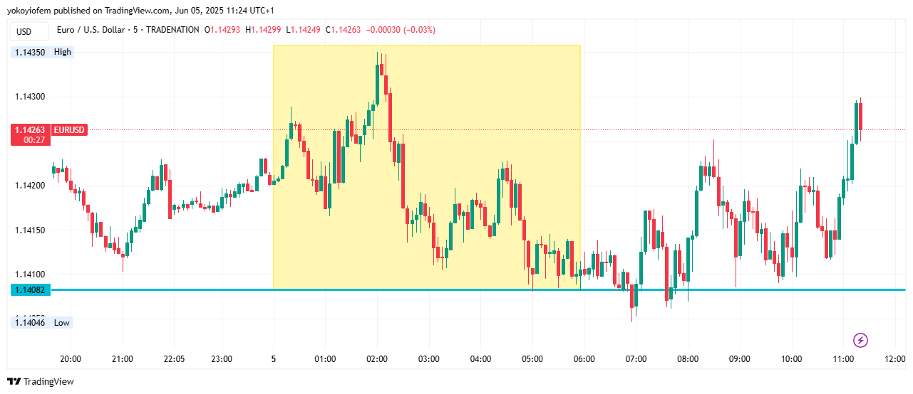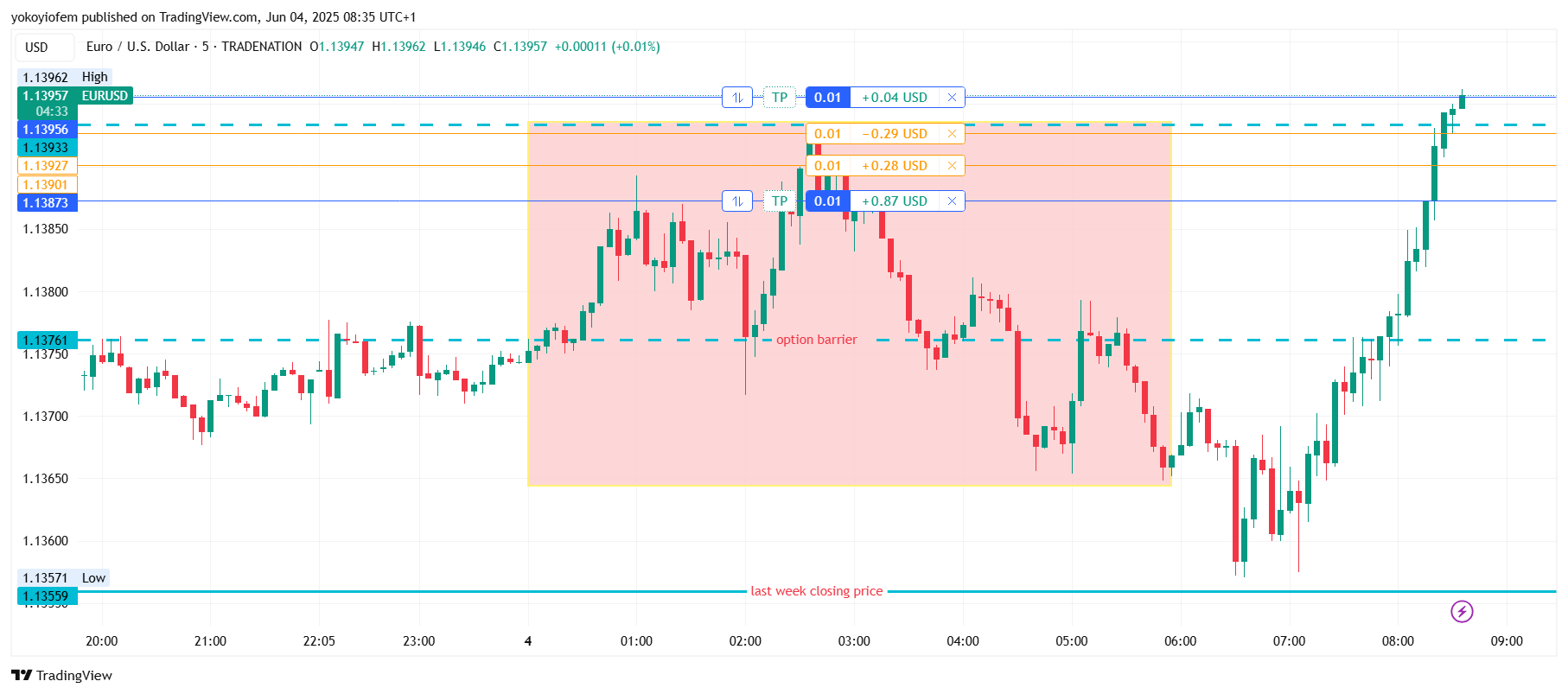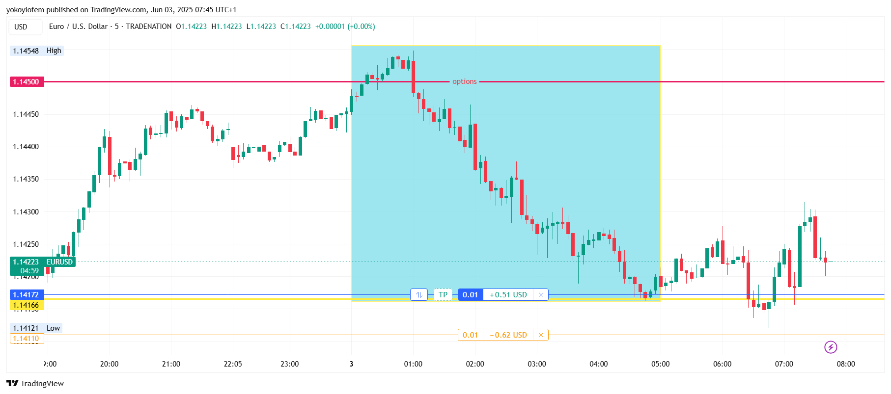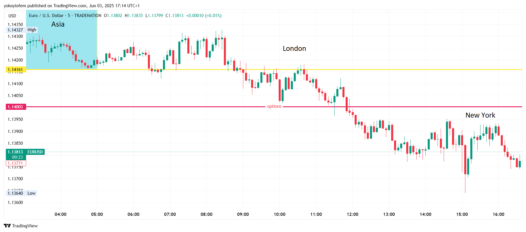 Price is still ranging inbetween the option orders stacked at 1400 and 1450. The Frankfurt session ends and London session starts in 12 minutes, I expect it to bring some momentum to push price out of the current range.