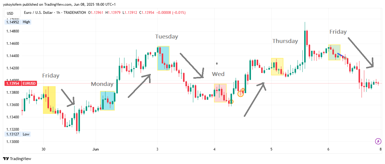 Take a look at the 1 hour sessions chart for last week. I noticed a daily pattern of up, down movement for each day (with the exception of Thursday)