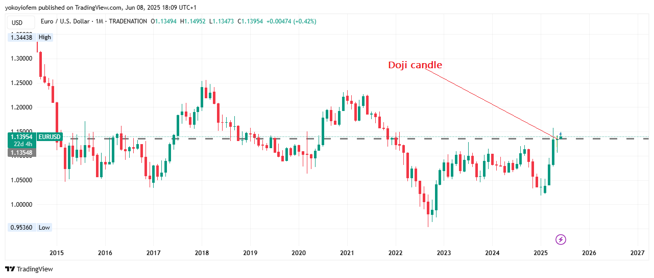 Also look at the 1 month chart you will see that for the month of may it was a doji candlestick pattern which signifies a possible end of the upward trend that began in February. In other words, let us watch out as we may have a bearish month of June with price falling below the dotted line which marks last months closing price of 1.13436
