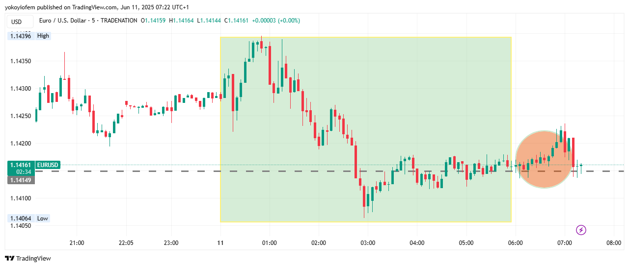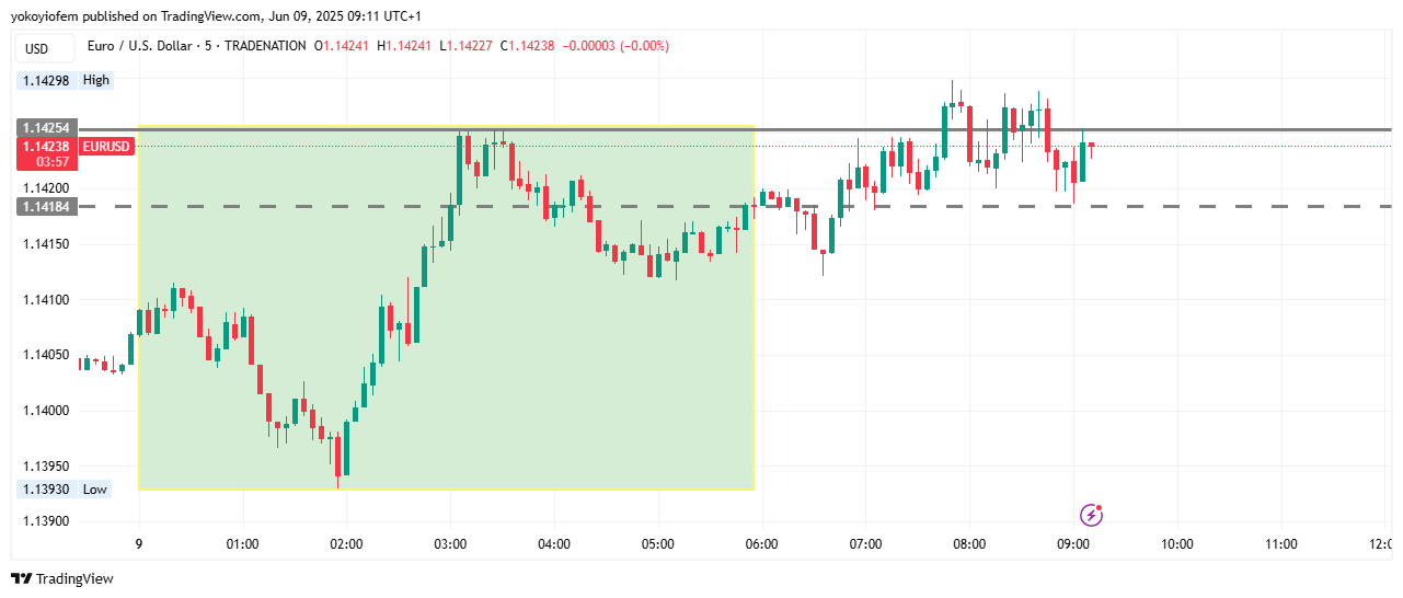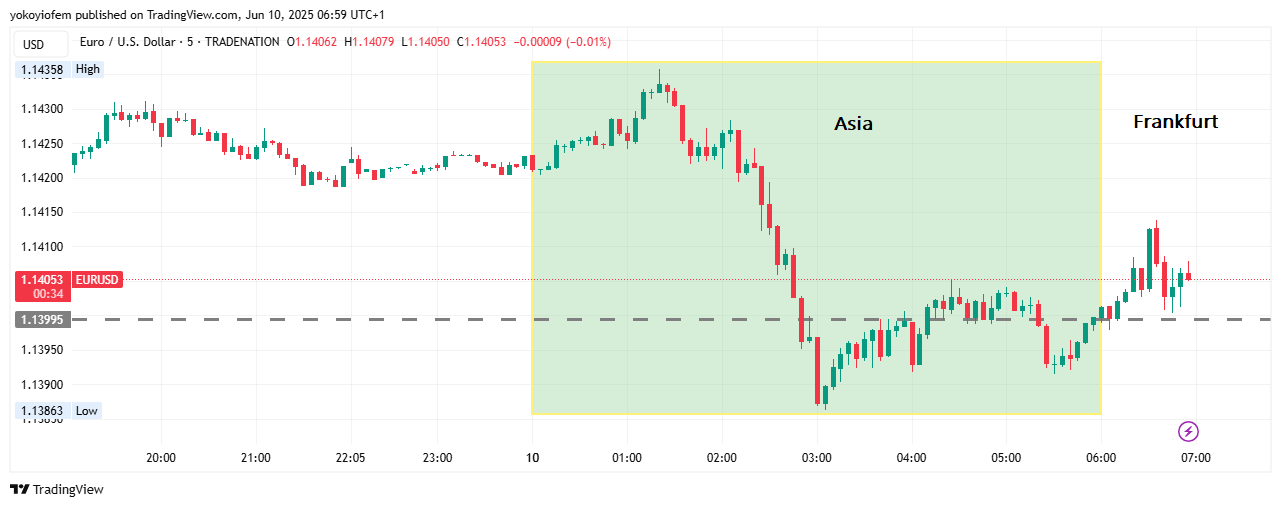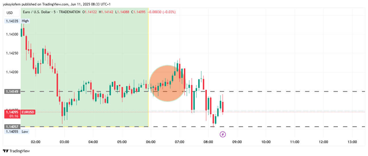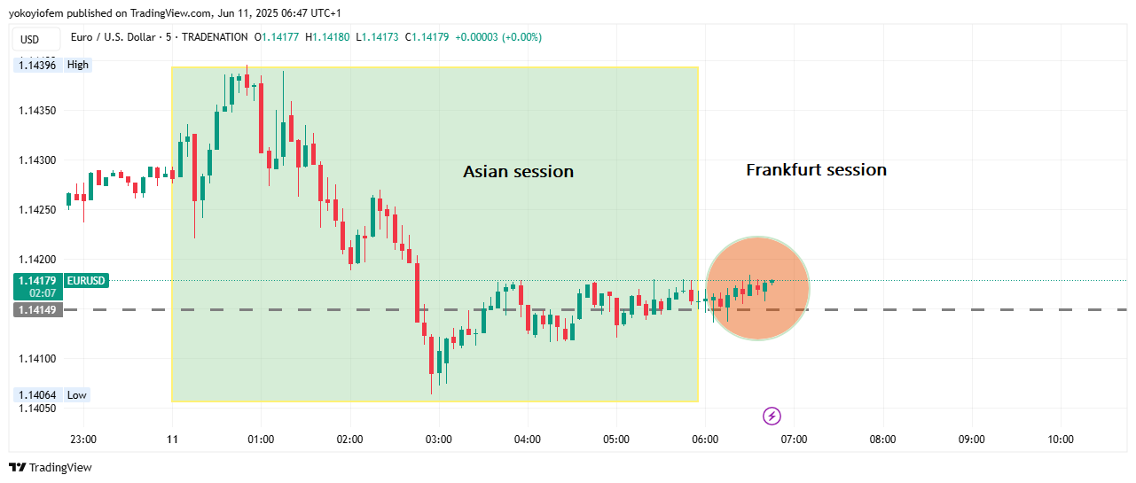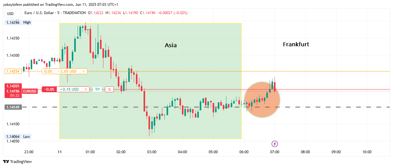 The first 5 minute of the Pre-Franky session is still holding price up (see dotted line) and preventing price from falling downward past it & a break below it (the dotted line) will be a sell opportunity. For now price is still ranging around the Asian high.