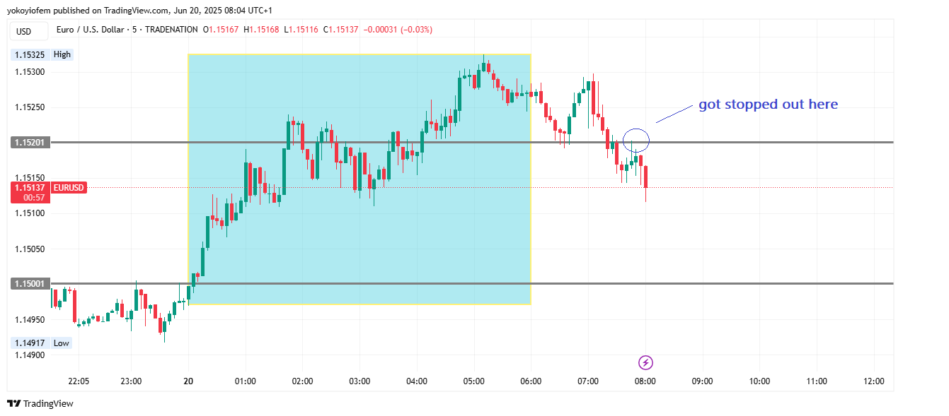 I got stopped out on my first entry because i adjusted my stop loss upward (which i shouldn't have done). So, i reentered the buy trade and was able to recoup the loss from the first stop out. After that it just went downhill and i tried to reenter a buy but i tapped out. Not a good trading day as i barely broke even but I'm done for the day.