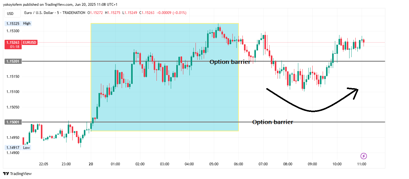 Notice how price ignored the second option barrier and instead reversed upwards and went back to ranging around the first option barrier level