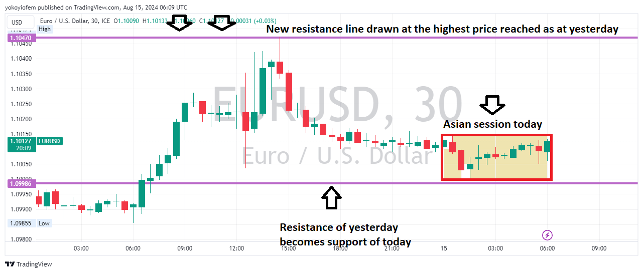 Today I've drawn resistance and support lines over and below the Asian session highest/lowest prices.