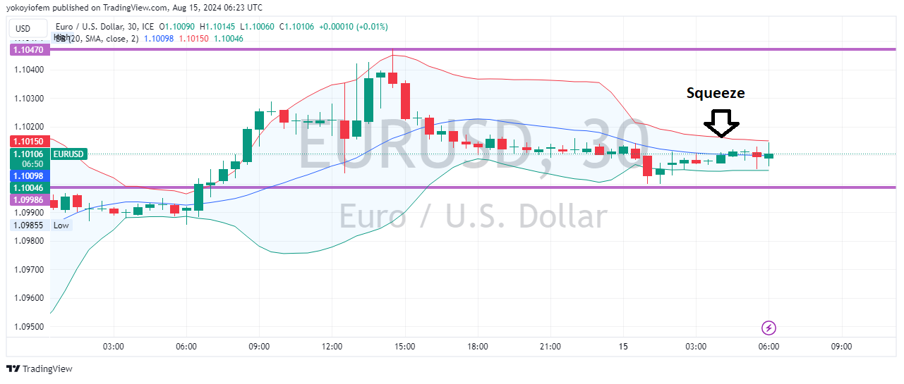 The Bollinger band indicator is showing a squeeze or narrowing of bands. This indicates a major up or down trend may be about to start.