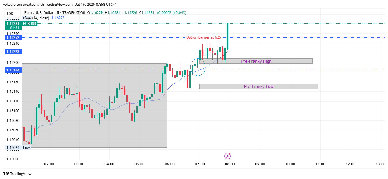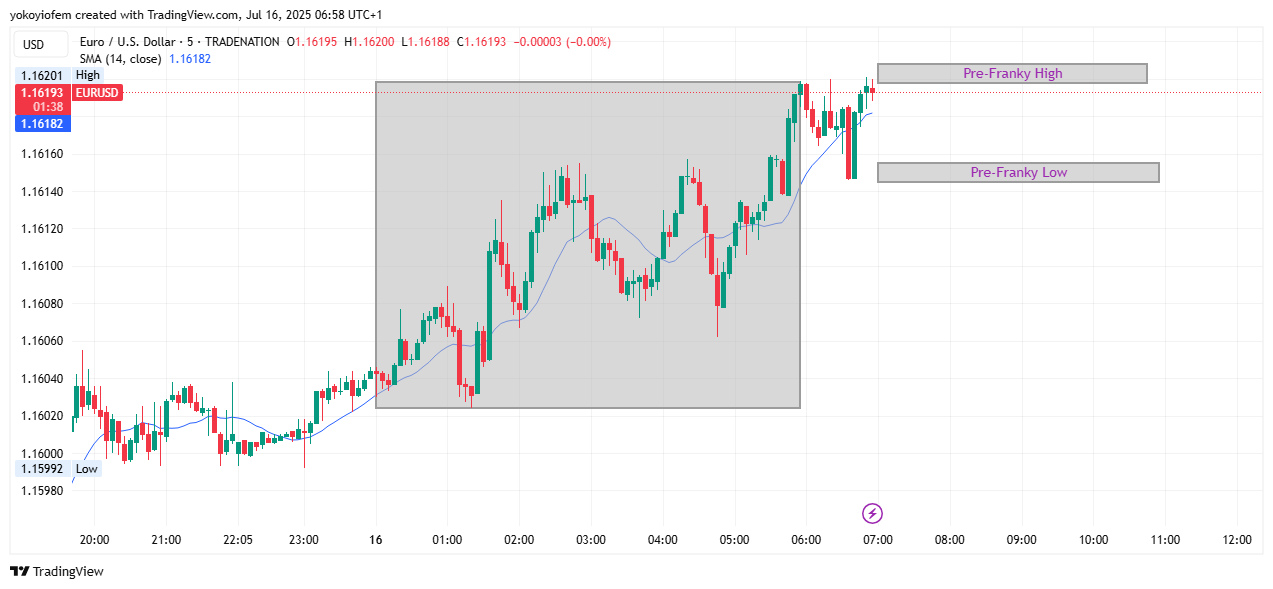 Today I am down 6 pips after i shorted the market at 1659. I had actually gone long but exited the trade after it was ranging at the prefranky low (big mistake, i shouldnt have exited). Next time i wont exit it, because if the reversal doesnt happen at Franky it may happen during London just like what happened today.