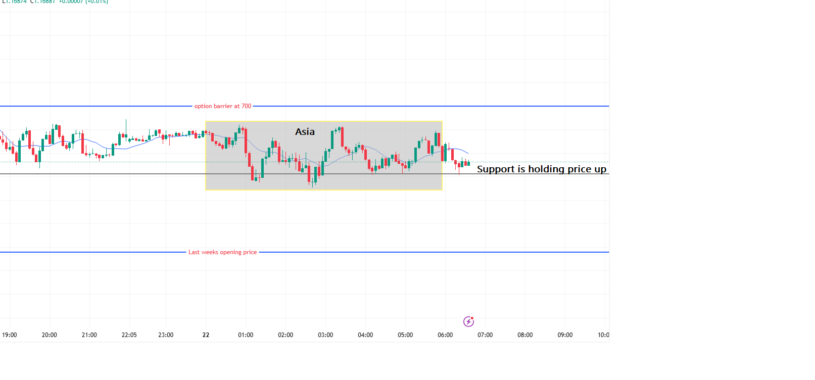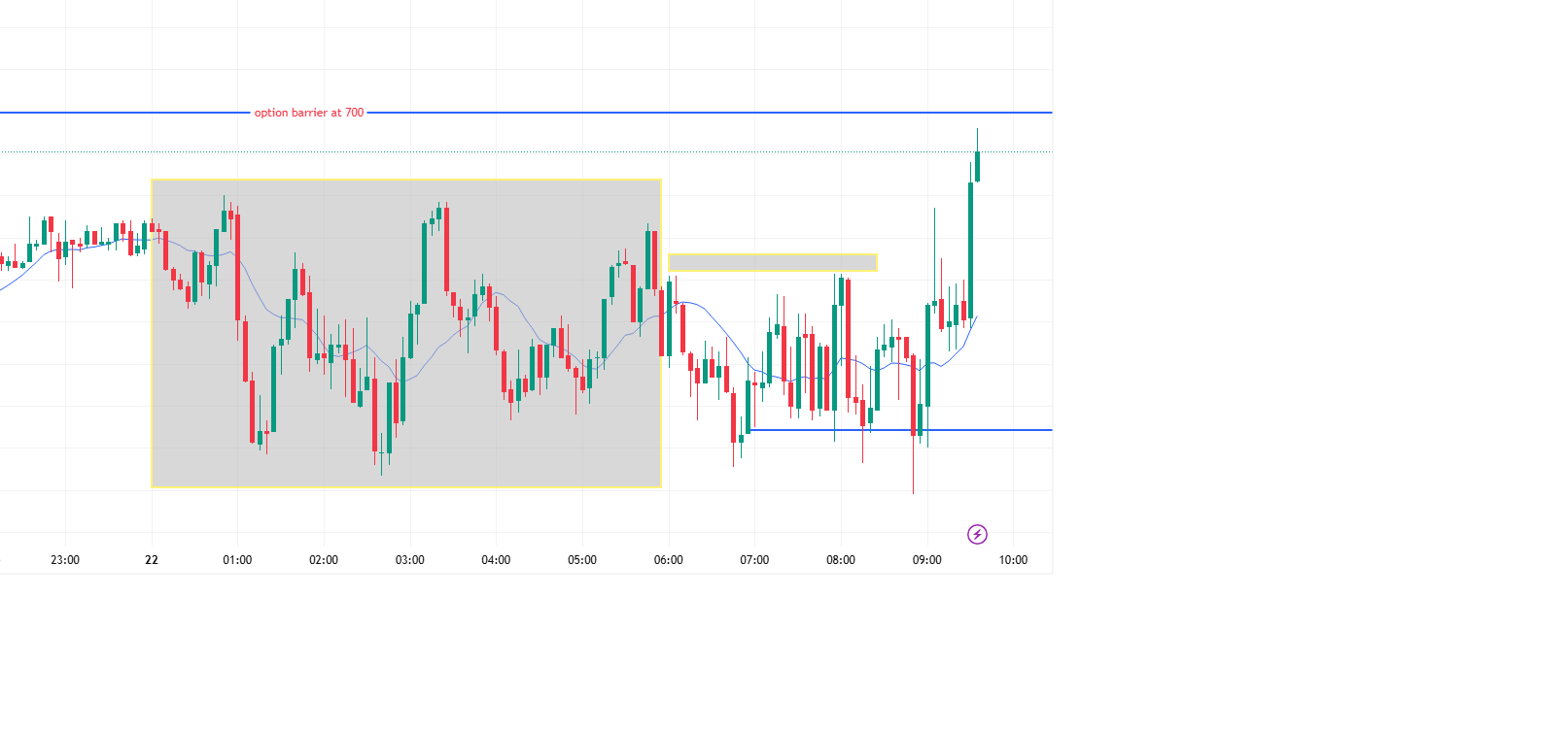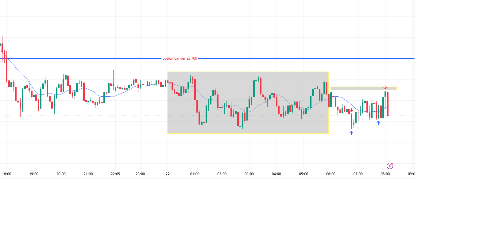Today price is just consolidating after breaking last weeks opening price. There is an option barrier at 700 and a support i identified which is holding price up. I expect a big rally in the upward direction today
