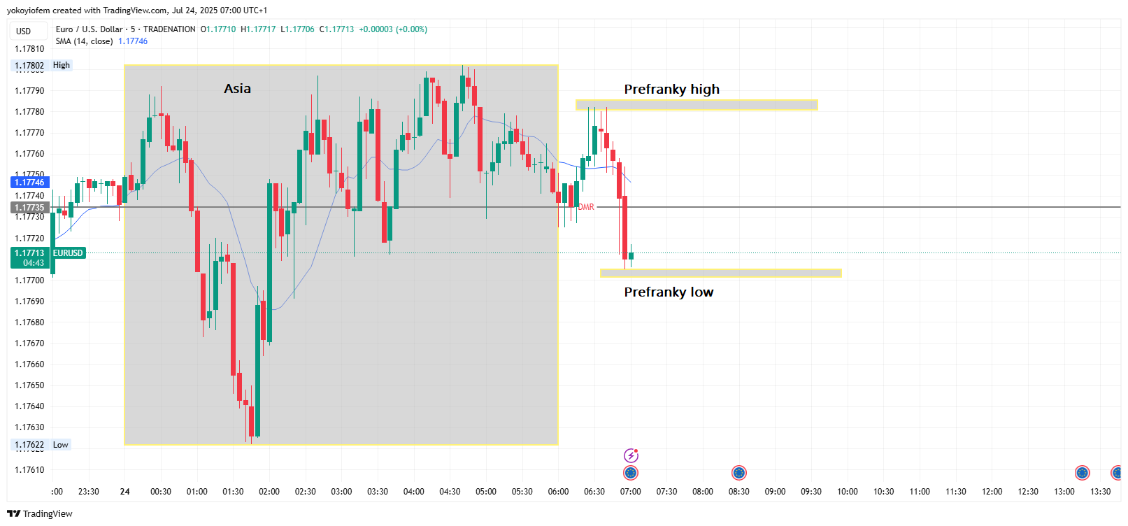 Today price was ranging around the Pre-Franky low and then it rose to break the Asian high.