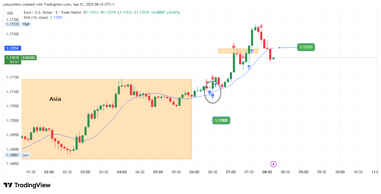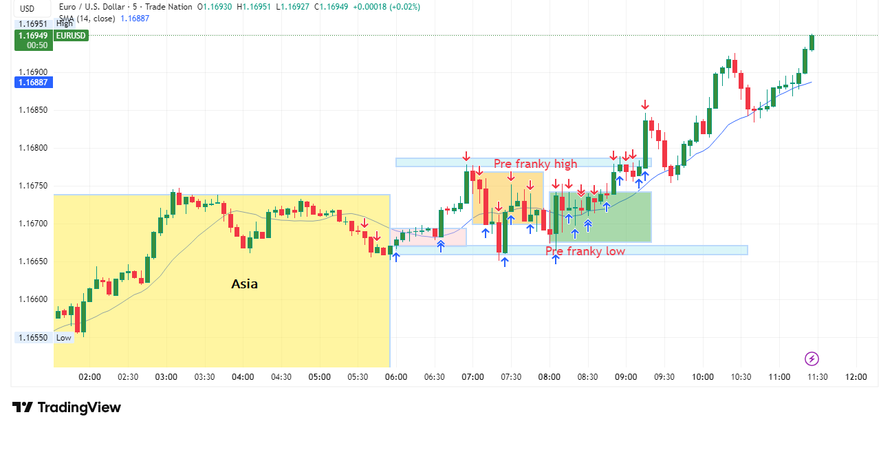 First 15-30M of Franky goes till the nearest hourly highs or lows, then the last 30 minutes of the Franky sets the direction (normally the high or low of the day/session). Then London breaks in that direction fast. Classic Franky fake & London break.