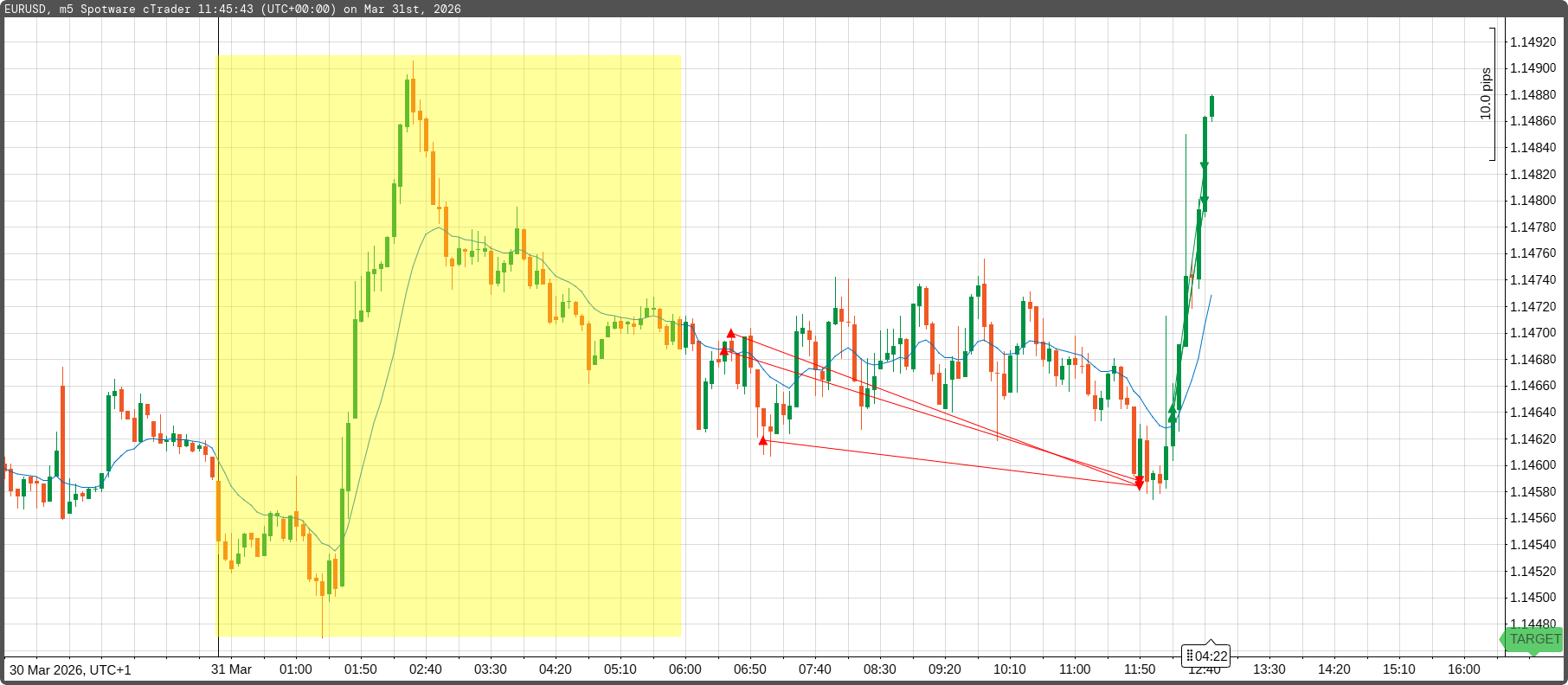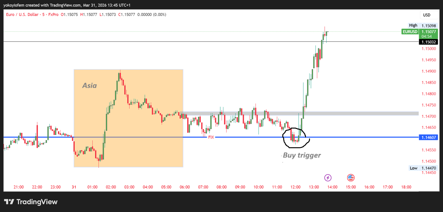 On the last working day of every month, price always interacts with the previous days 4 pm closing price aka the 4pm London FIX. Check yesterdays 4 pm closing price for EUR/USD and you will see it is 1.1460 and I marked it with a blue line. So I set my stop loss below the FIX. My SL was hit the first time but I went long again when I saw price rising above the FIX. That was my buy trigger.