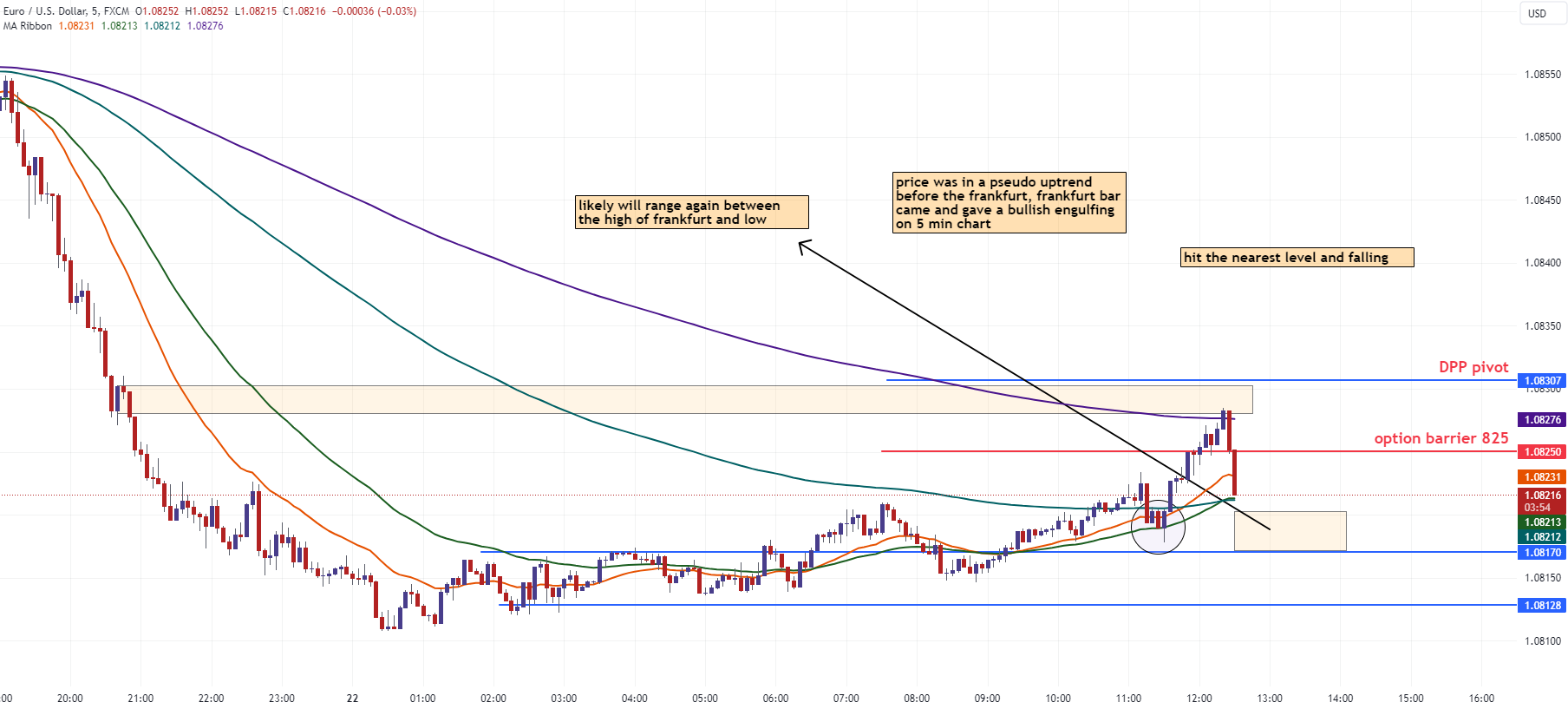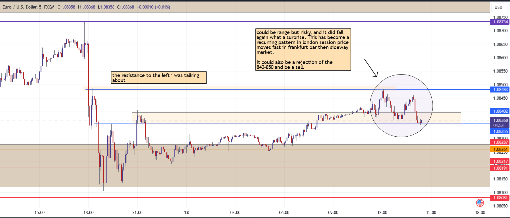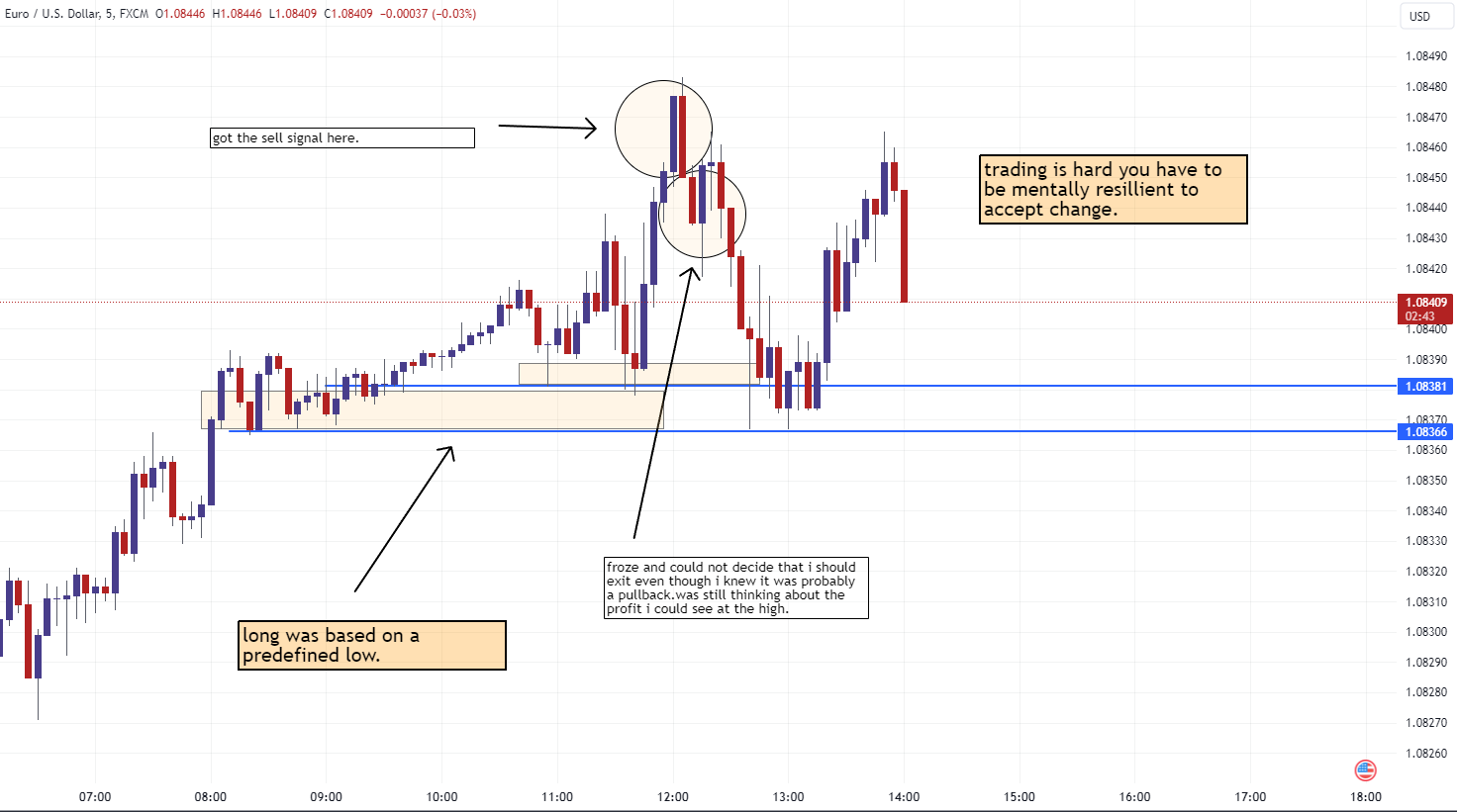 The mistake i made today was to get attached to the number of dollars(10 pips) rather then watch that frankfurt was hitting a strong resistance on the left. When it fell with a bearish engulfing on 5 minute chart... it would sound unbelievable but i knew that it could easily fall back to frankfurt low but i could not adapt.