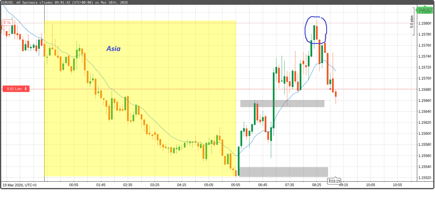 I just took a short trade on EUR/USD after price interacted with the edge of the Asian box and formed a reversal pattern.