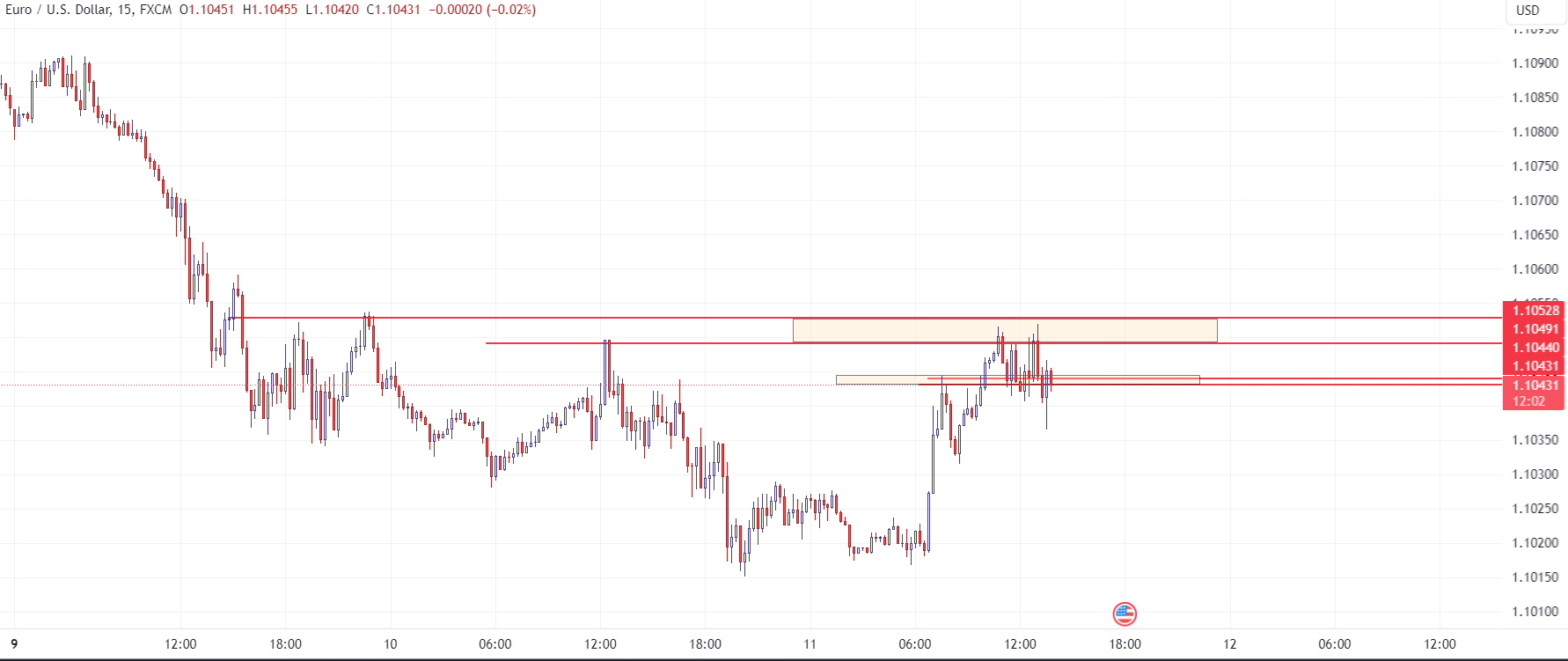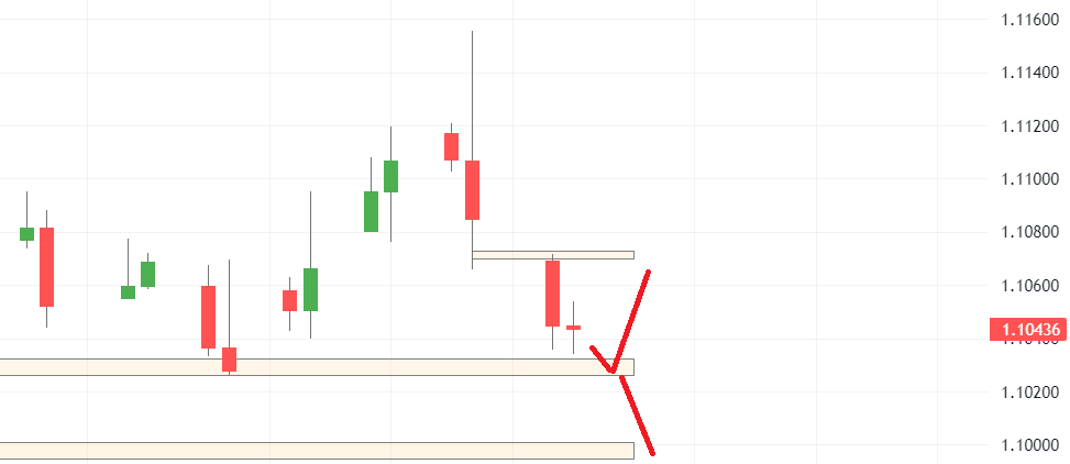 The levels in play are 1.1040-1.1035 support, the break below it will mean that the price has failed over the larger resistance marked on the chart.