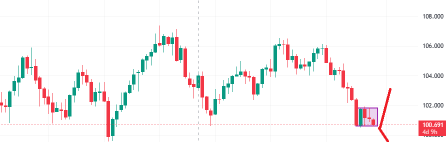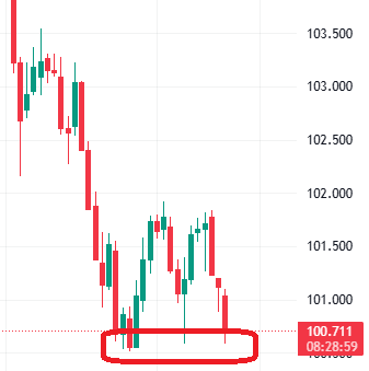 a. The level holds, or we get a false break. This would mean a range between 100.5 & 102, until there is a break to either side.