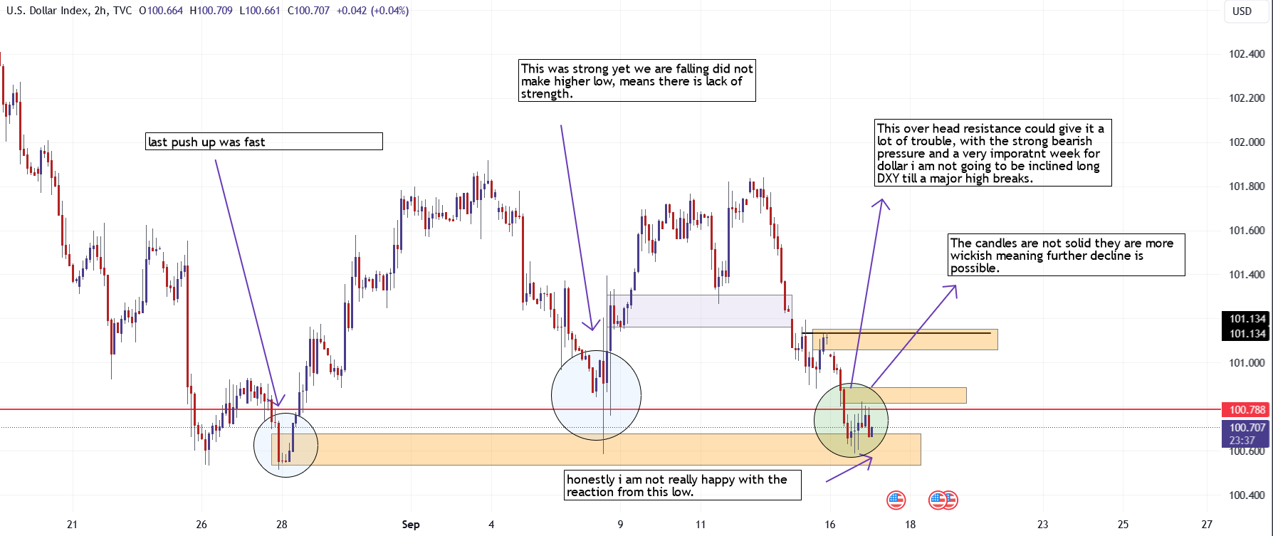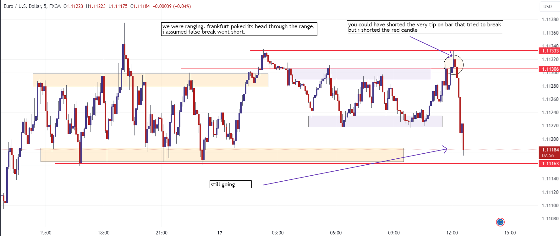 During Franky tomorrow, I'll look for a false break to the upside on EUR/USD, if I'm trading the scenario a. I'm biased to the downside on EURUSD. But if we break the range low on DXY, it would change.