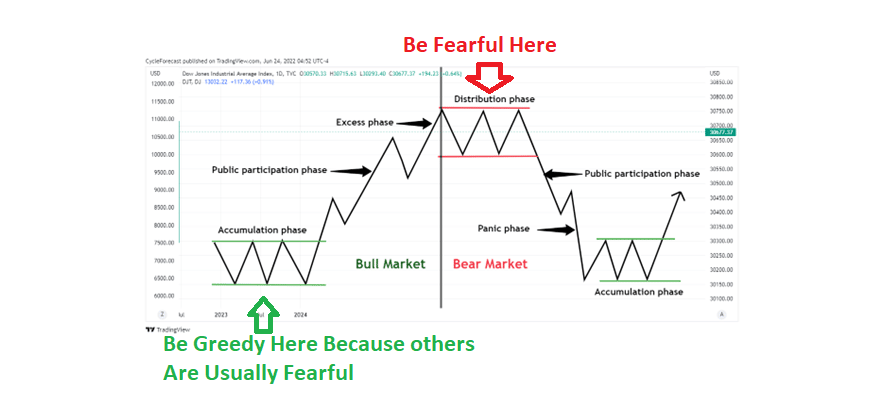 Be fearful when others are greedy: I understand this to mean we should study price action and apply the Dows theory on market phases.