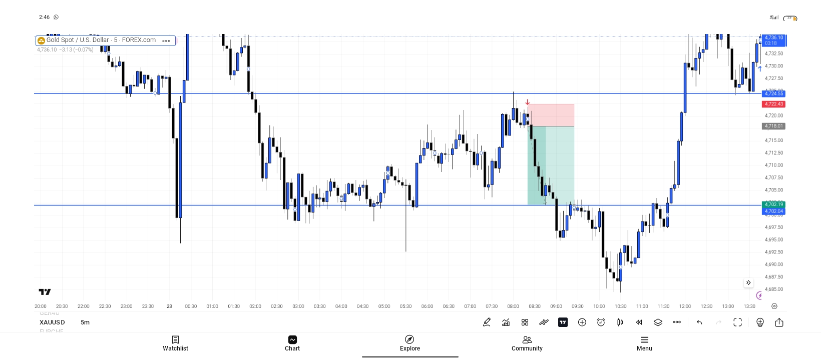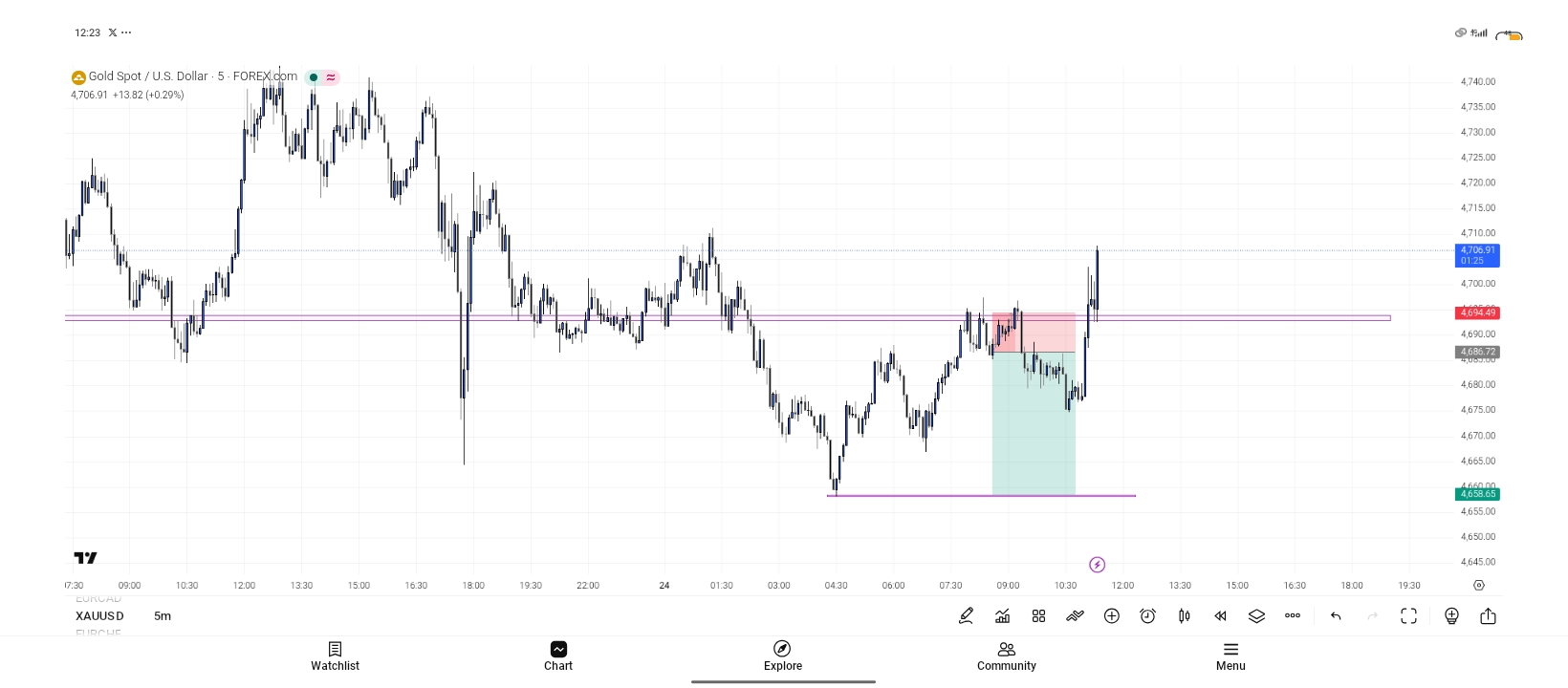 Before touching the 5-minute chart, the higher timeframe was consulted first. On the 1-hour chart, a clear horizontal resistance zone was identified around the 4,694 – 4,696 area marked by the purple/pink horizontal lines visible across the entire chart.