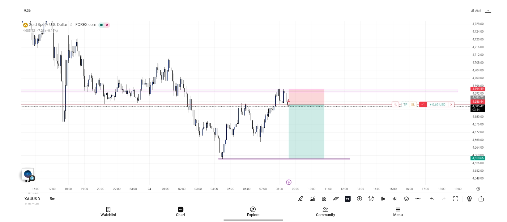 The entry was taken at ~4,686.44, with the stop loss placed above the resistance zone at ~4,694–4,696 the level where the thesis would be invalidated if price broke and closed above it. The take profit is targeted at the 4,638–4,660 support area, which was previously established as a key demand zone earlier in the session. The pink shaded area on the chart represents the risk zone above entry, while the green shaded area represents the reward zone below.