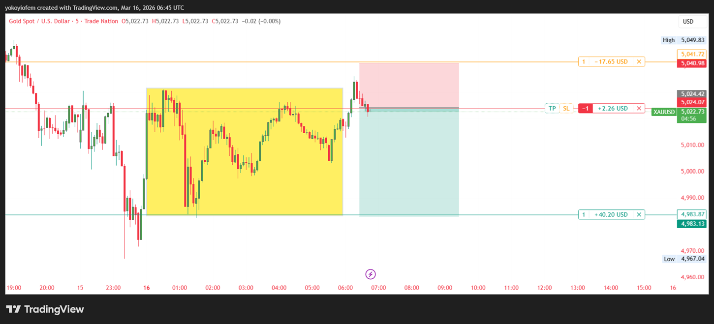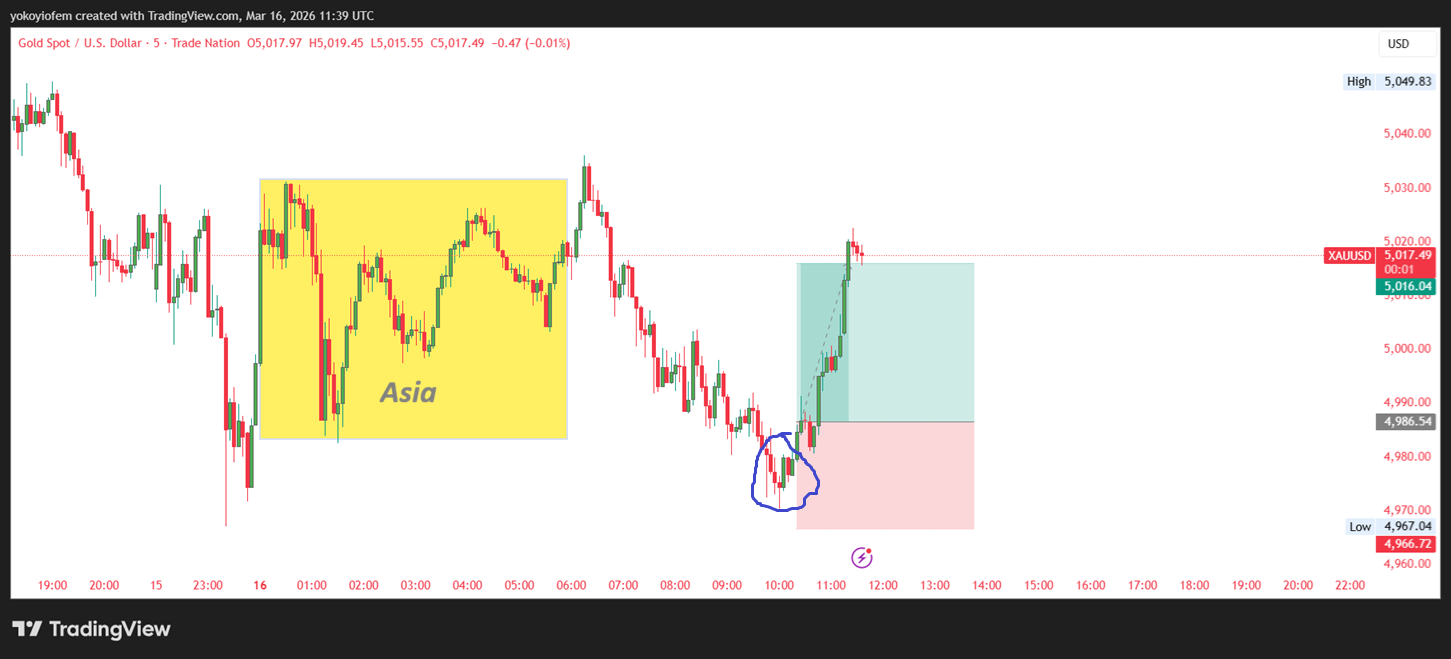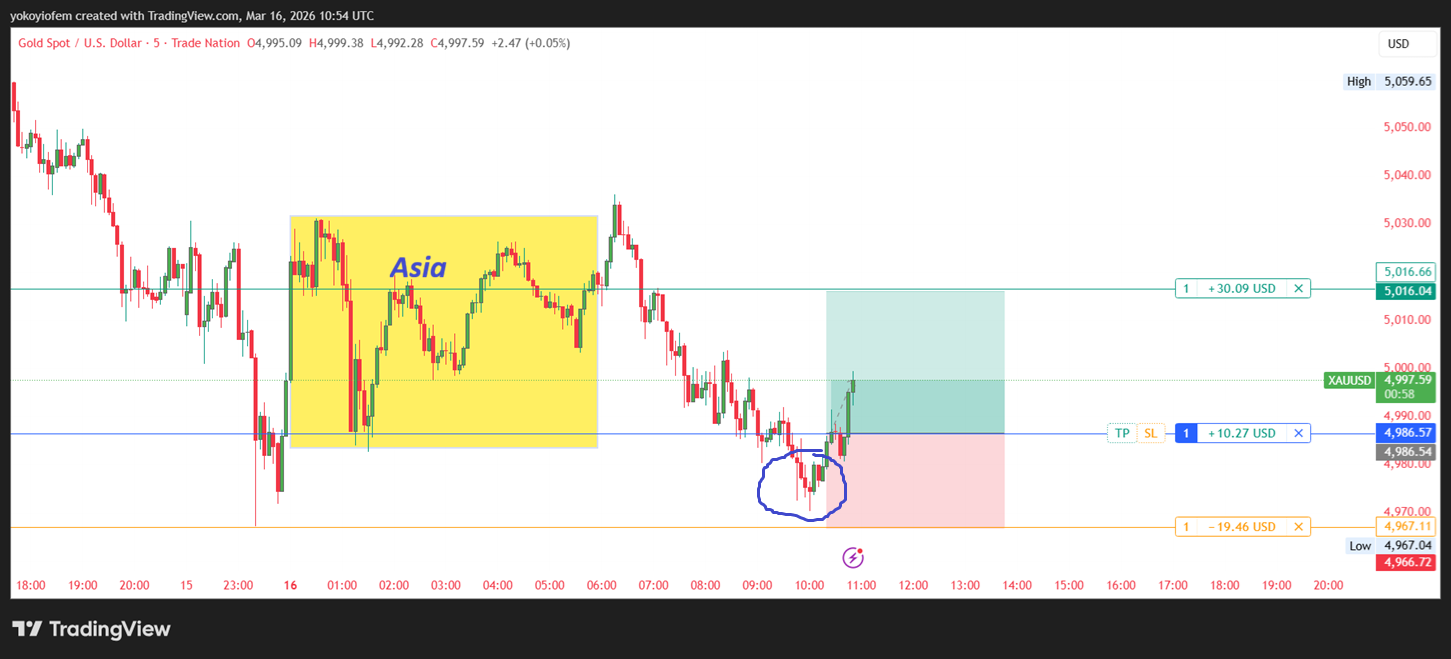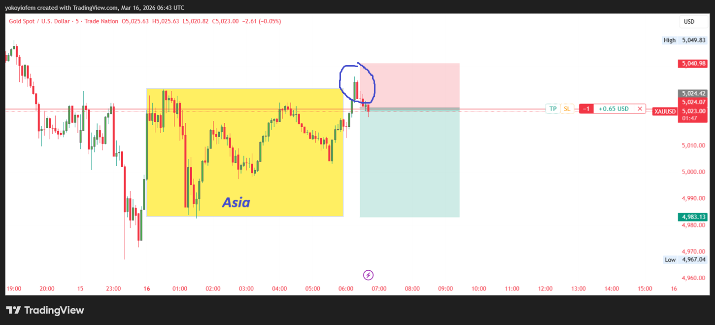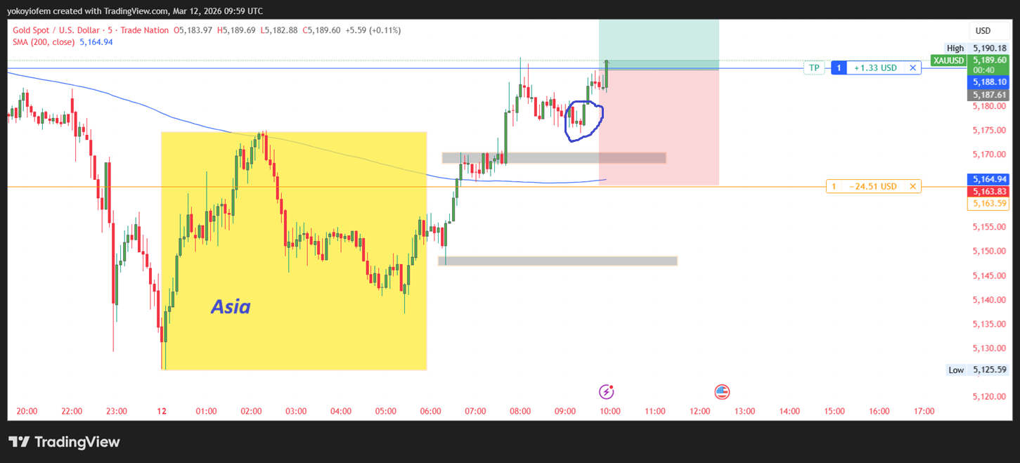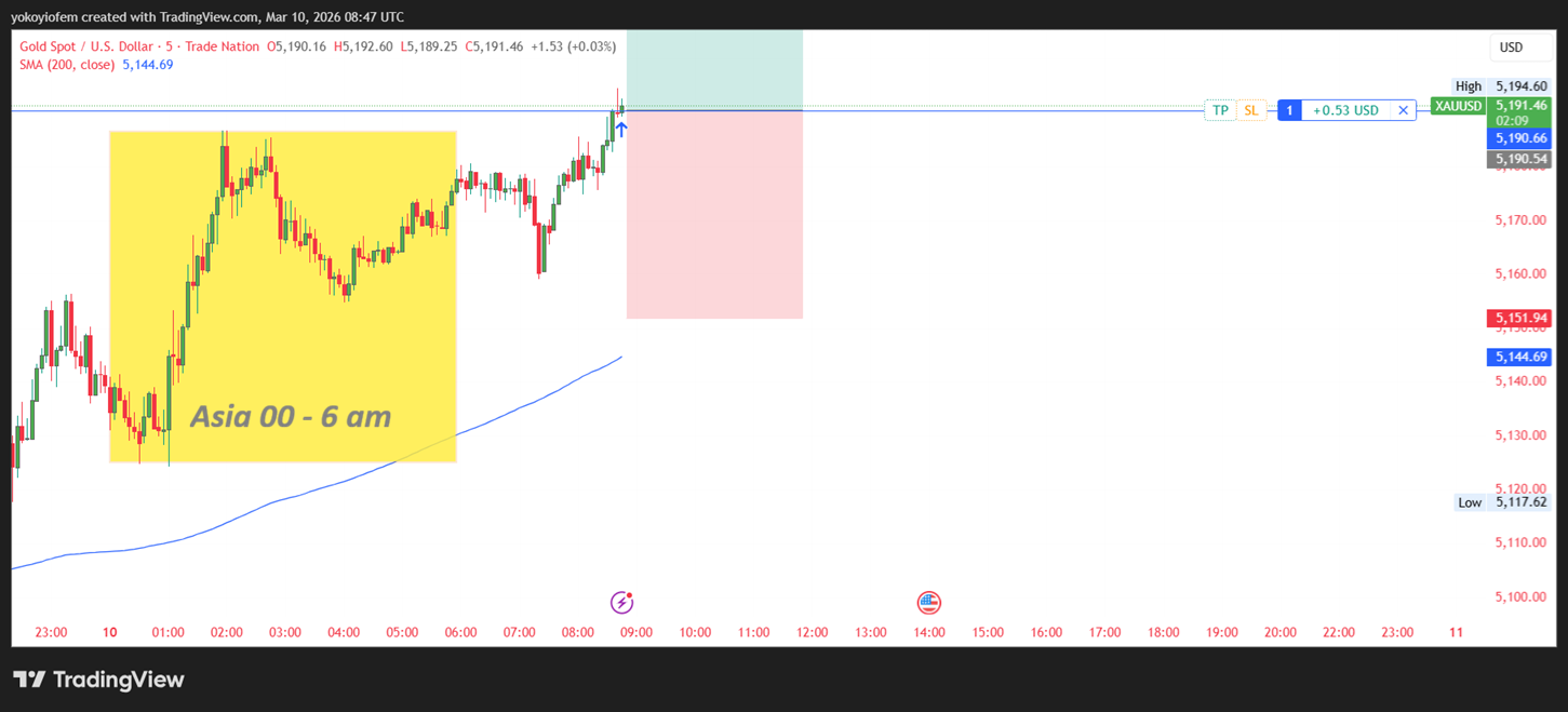 I just went long on gold because price broke out of the Asian session and is reversing back into it. My TP is at the Pre-Franky high and SL is below the reversal pattern