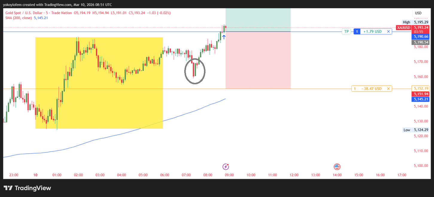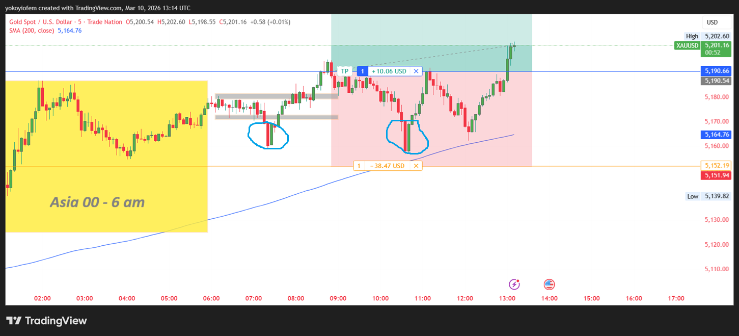 Ive taken another buy trade on gold because after the NY session started, price seems to have the momentum to reverse back into the Asian range. The reversal pattern has been spotted (encircled in blue) so I have gone long.