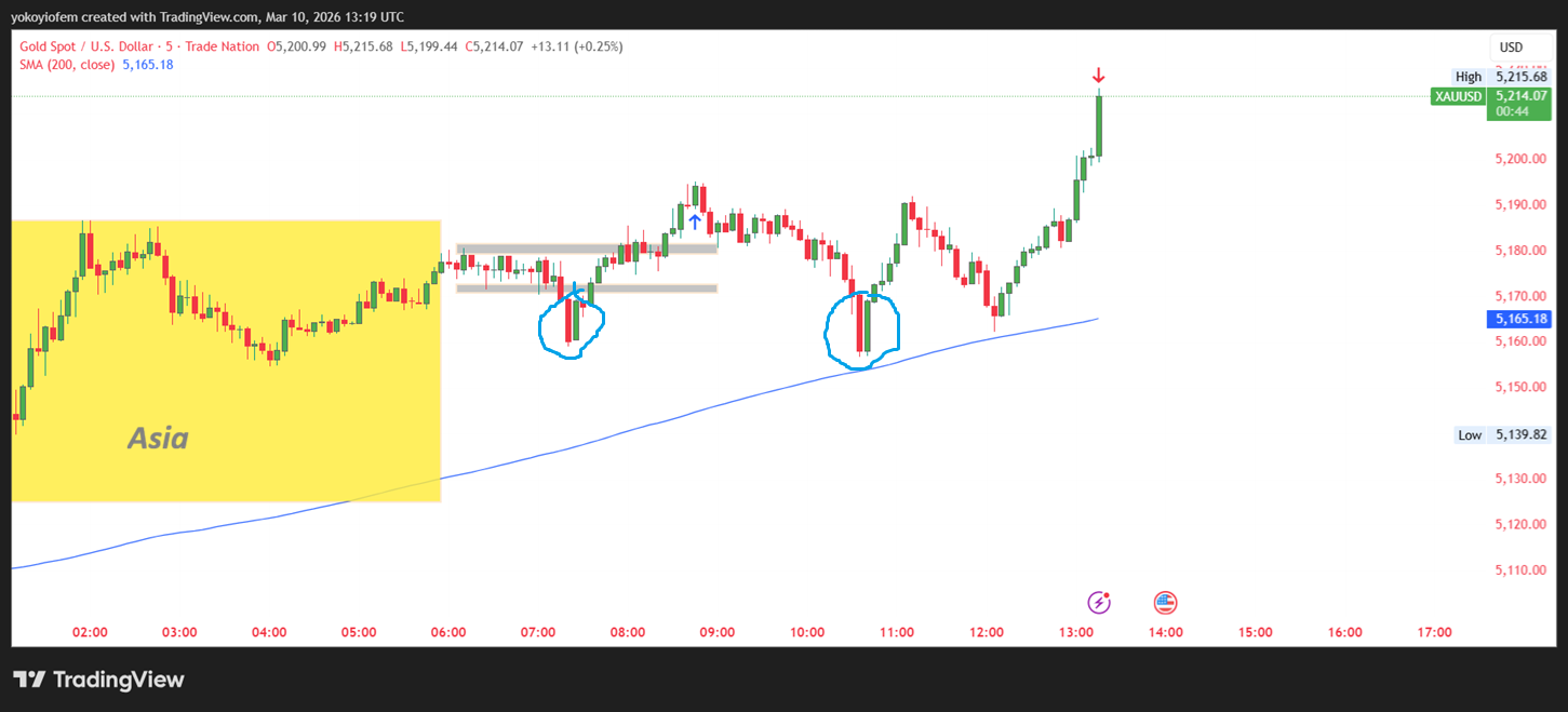 1. The buy trigger was the candlestick pattern i encircled in blue, it appeared twice, the first during the start of the Frankfurt session and the second during the early hours of London.