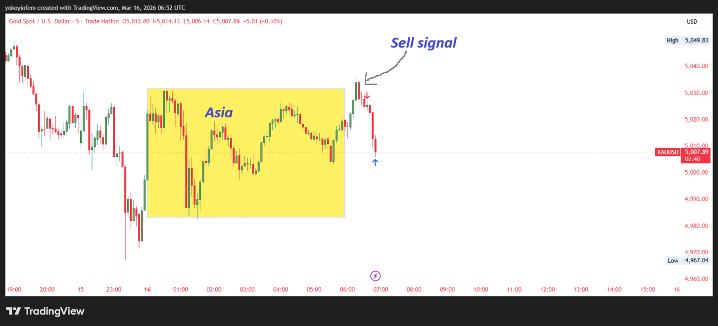 Sell signal spotted on gold. Price is trying to reverse back into the Asian range