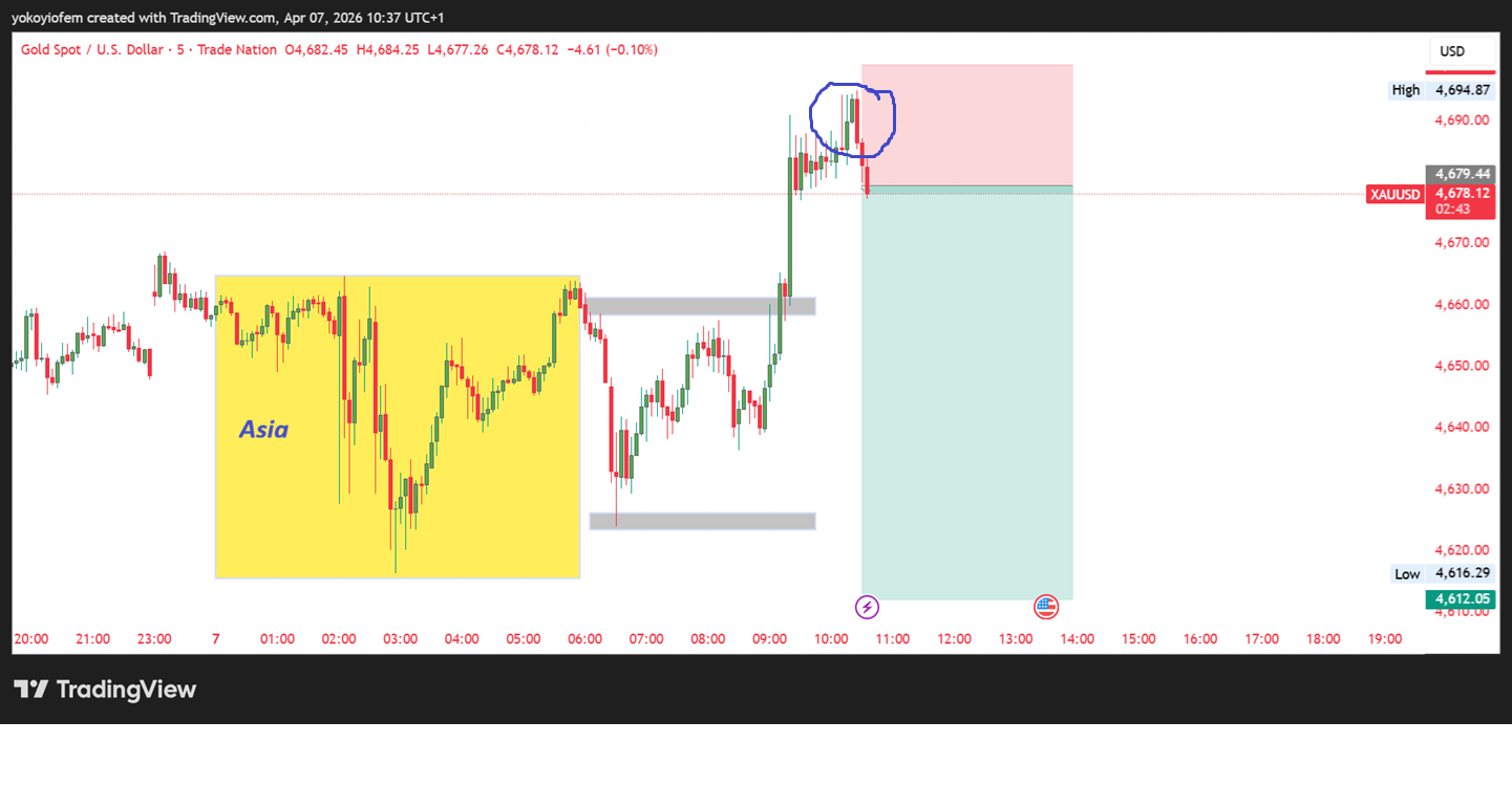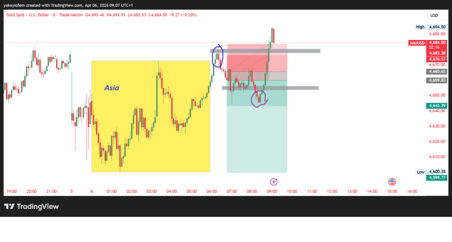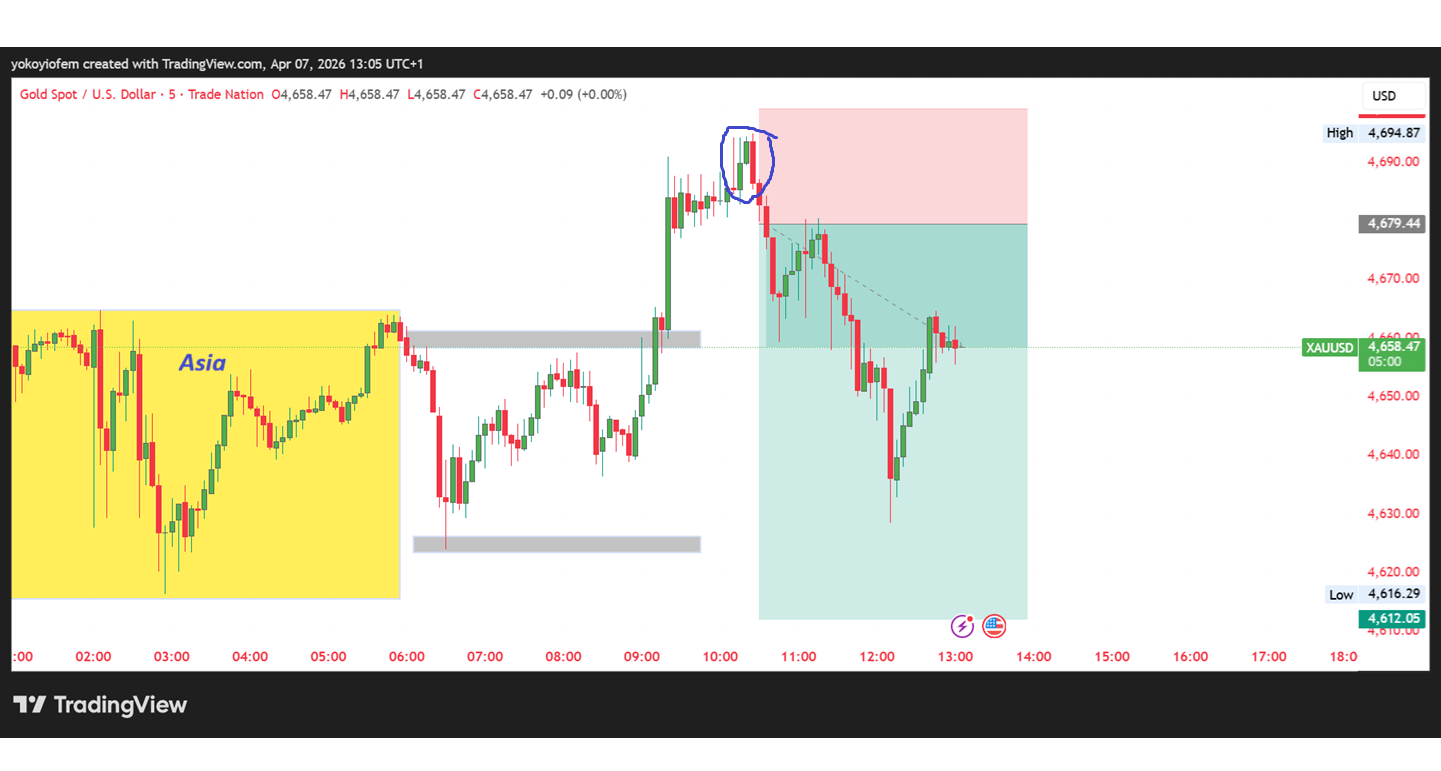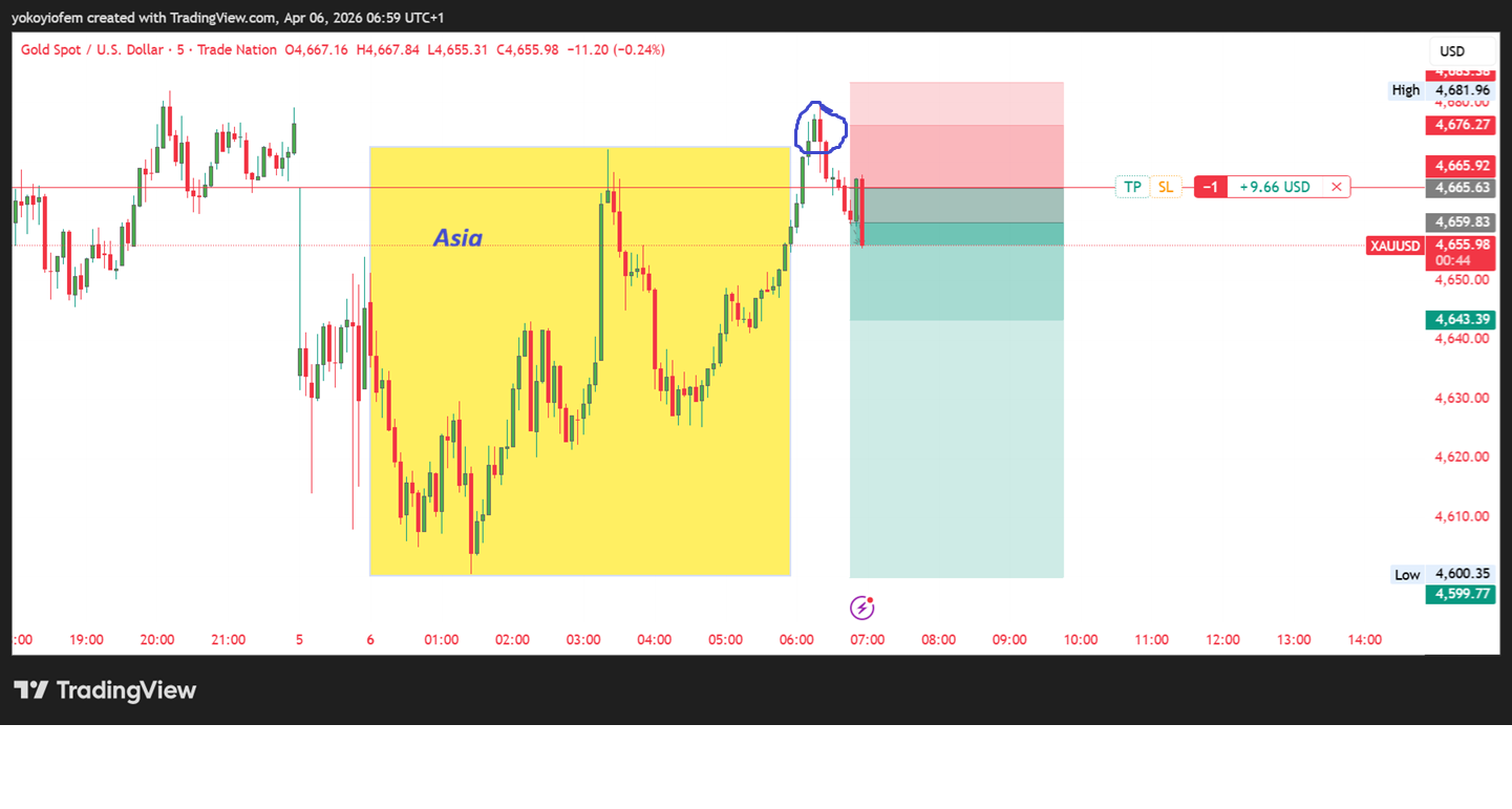 I am short on gold because price broke out of the Asian range, and reversed back in, leaving a bearish engulfing in its trail which served as our sell trigger.