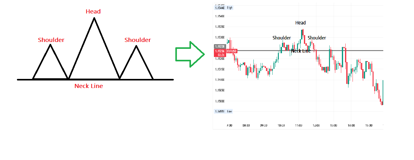 Head & shoulders pattern looks like one big triangle, flanked on the left and right by two smaller triangles.