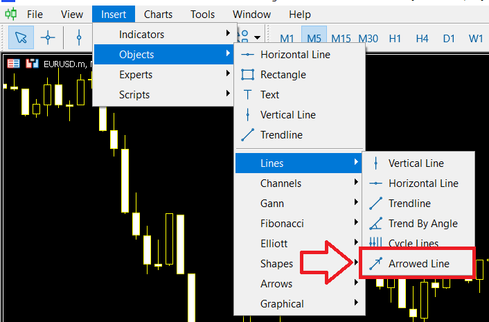 To use the arrowed line tool on mt5: click on "insert", "objects", "lines", then "Arrowed Line"
