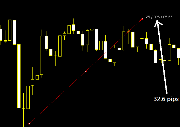 For example if the arrowed line tool shows you a reading of 25/326/85.6 then it means 25 candles in-between, 32.6 pips and 85.6 degrees line inclination.