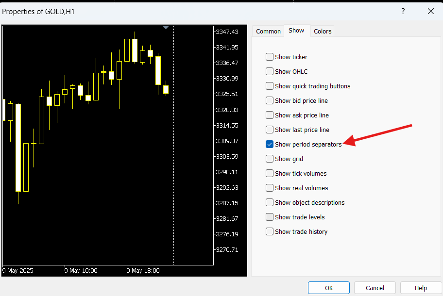 Right-click on your MT4 or MT5 chart, click on "properties", "show", "show period seperators"; then cick on "ok"