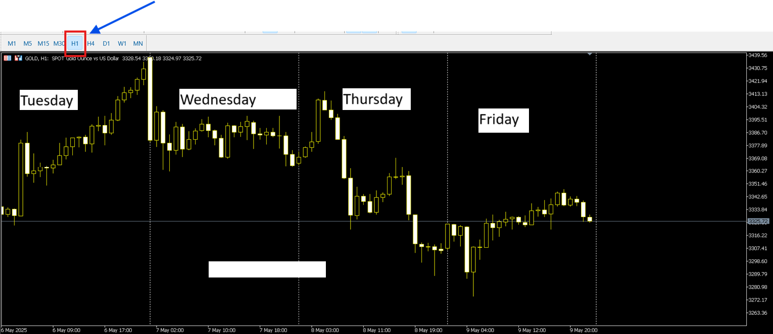 Go back to your MT4 or MT5 chart and select the 1 Hour time frame. You will notice some lines appear on the chart splitting the screen into different days.