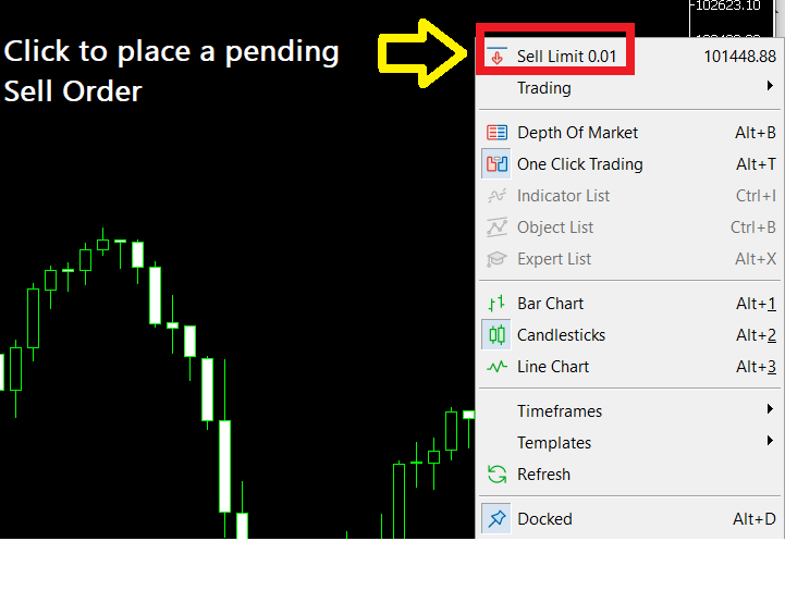 Note that to open a Pending Sell Order you right-click above the current price and to set a pending Buy Order, you right-click below the current price.