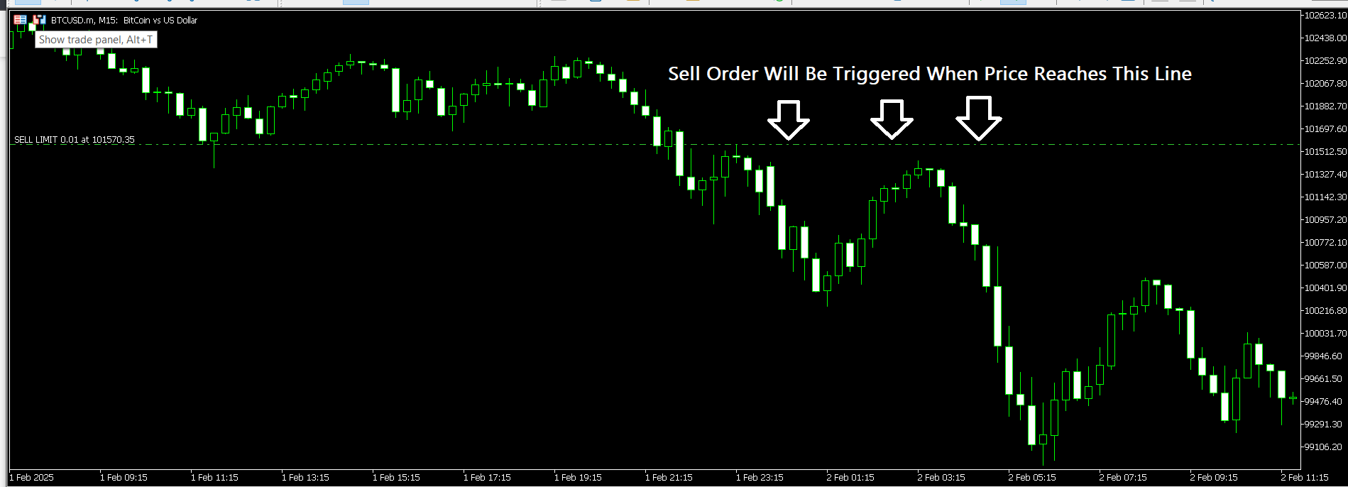 I will give an example of how to place a Pending Sell Order on an MT5 BTC/USD chart.