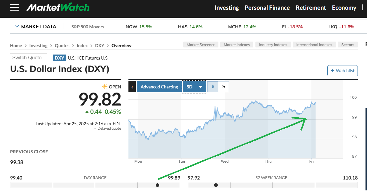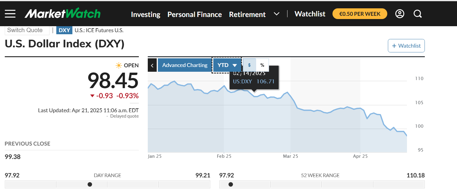Recently the tariff debacle has caused the entire world to get spooked and foreigners are pulling out of US capital markets. So dollar is falling which is opposite to what it used to be since dollar is a safe haven.