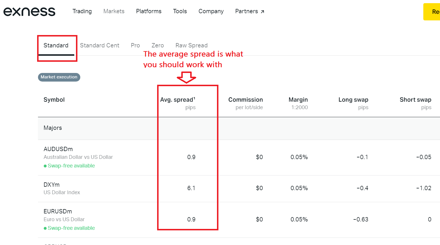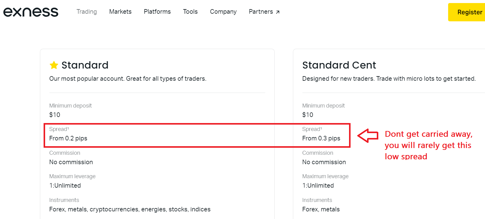 Lets us look at an example with the broker Exness, when advertising their account types they say spreads on the Standard Account start from 0.2 pips but this is rarely the case.