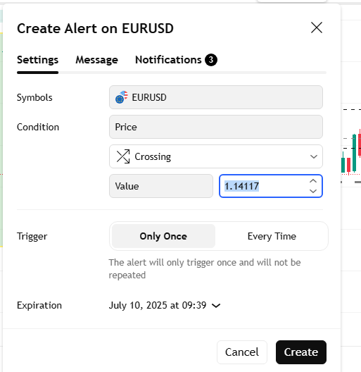 This is what the dialogue box for setting an alarm notification looks like on TradingView, you just specify the price and other parameters and create.