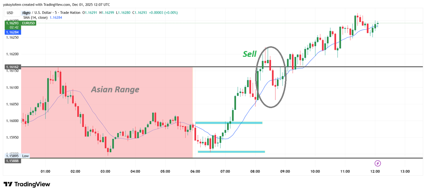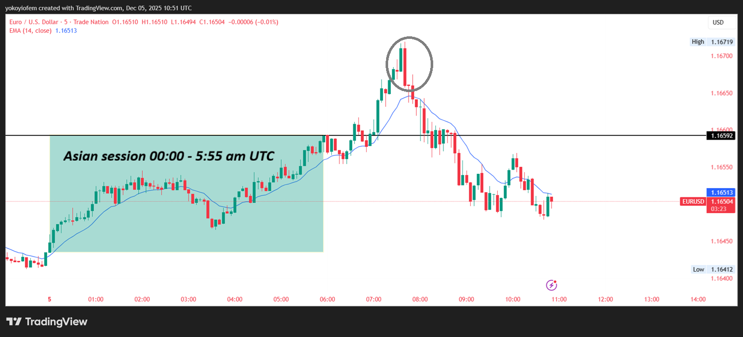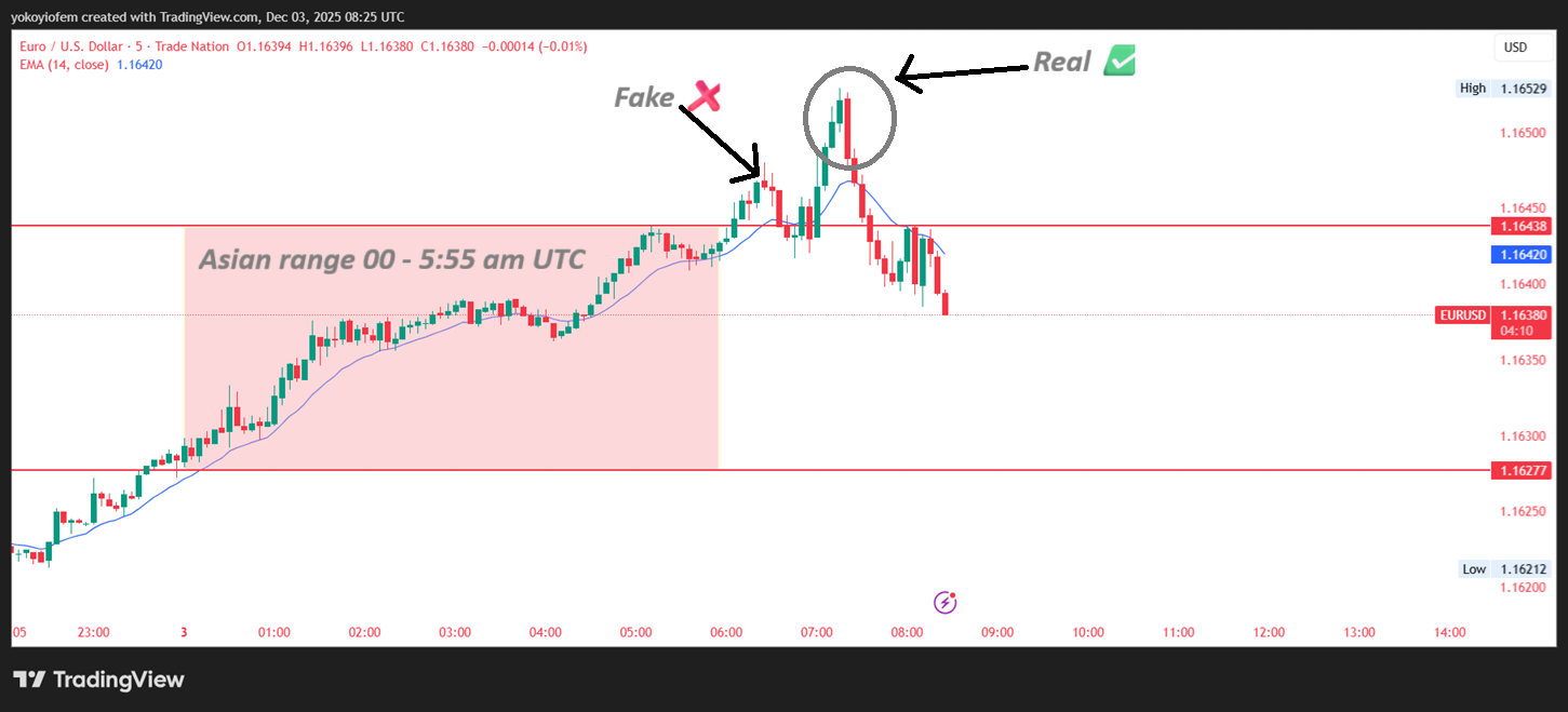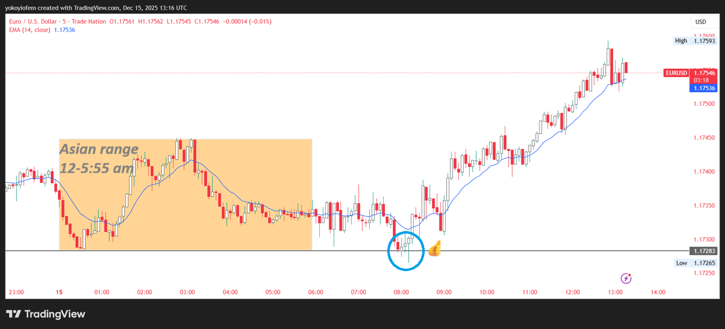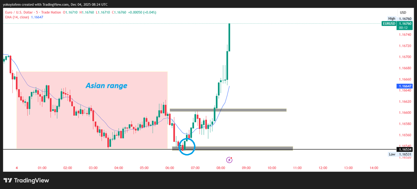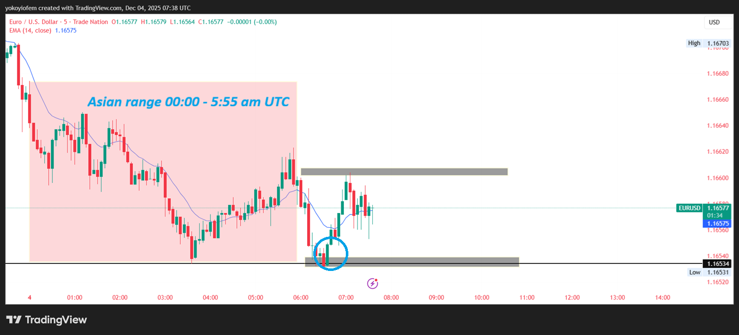 Today 4th December 2025, a beakout of the Asian low happened at 1.1653 and an opposite green candle formed resulting in an upward mini-trend during the pre-frankfurt hour between 6 - 7 am UTC.