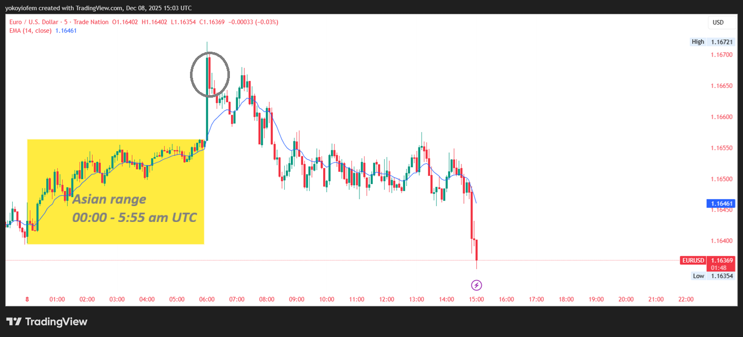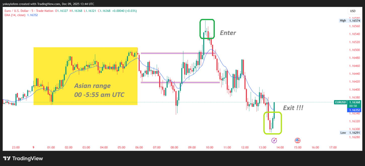 Today Dec 8th 2025, this is what our eurusd breakout strategy looked like. Price broke out of the Asian range during pre-franky and rose to aclimax bar of 1.1672 then it formed the first opposite candle from where you could have shorted.