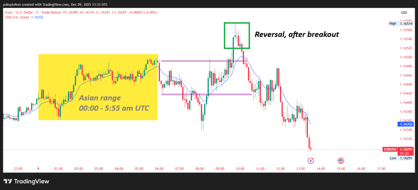 Today, 9th December 2025, the breakout and reversal happened during the start of the London session. if you were a seller, you could have sold at 1.1650 and held from edge to edge only closing after price crosses the lower Asian range and attempts to reverse upward