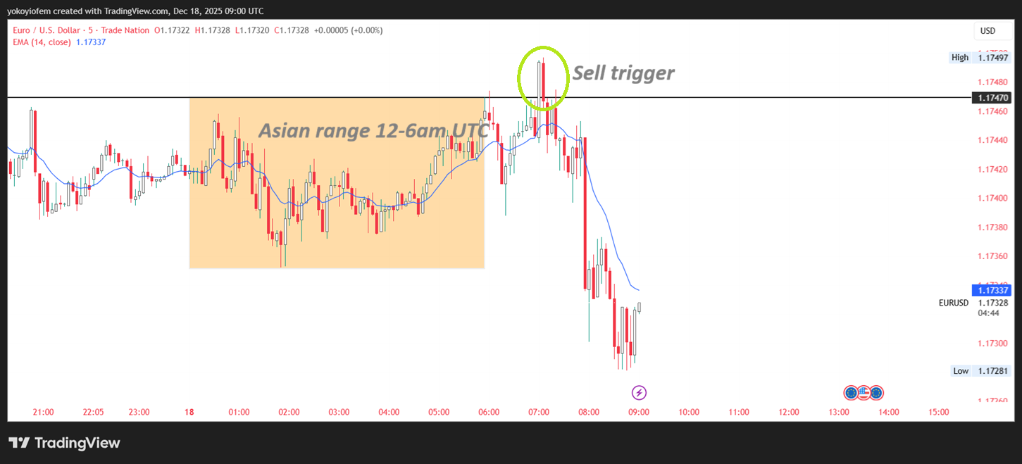 Today 18/12/2025 the breakout happened at the upper Asian range during the Pre-Franky hour (6-7am UTC) and the downward reversal followed. The play here ould have been to sell upon seeing the first opposite candle then hold the trade till the breakout of the lower Asian range (edge-to-edge).