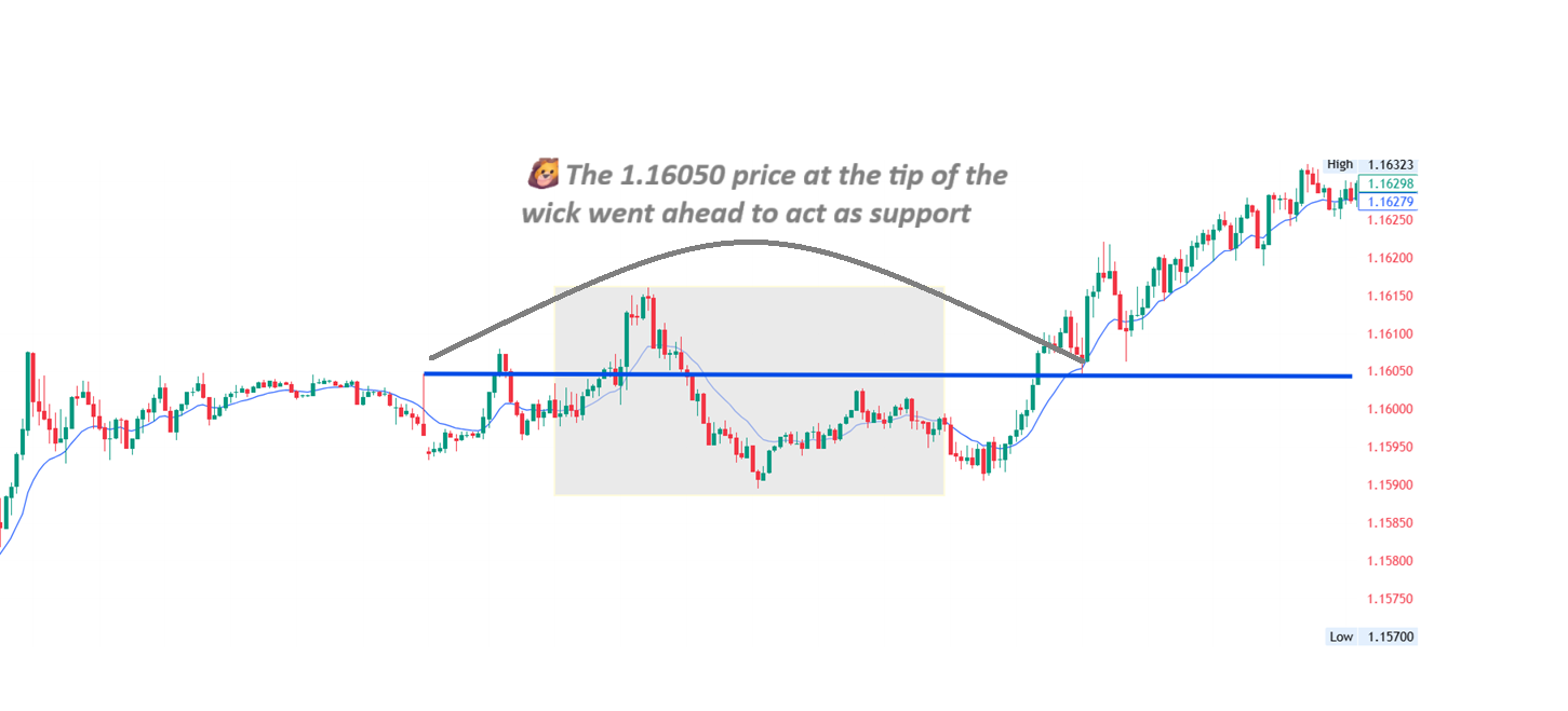 if you take your line drawing tool and extend a horizontal line from the tip of the wick across the chart, you will notice that it went ahead to act as a support level at 1.16050.