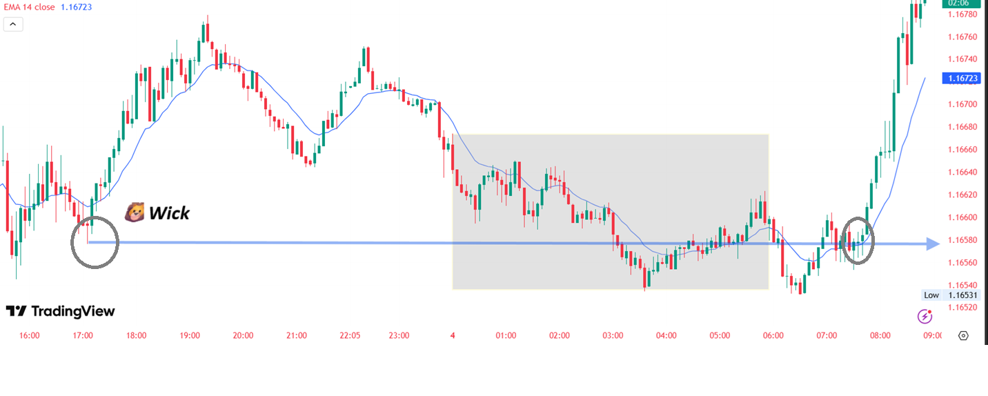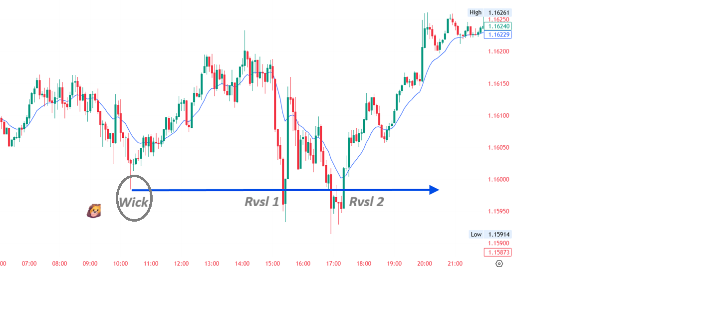 Look at this chart, there is a wick that stands out and drawing a blue horizintal line across the tip of the wick reveals price reversed upwards at the wick level of 1.15982.